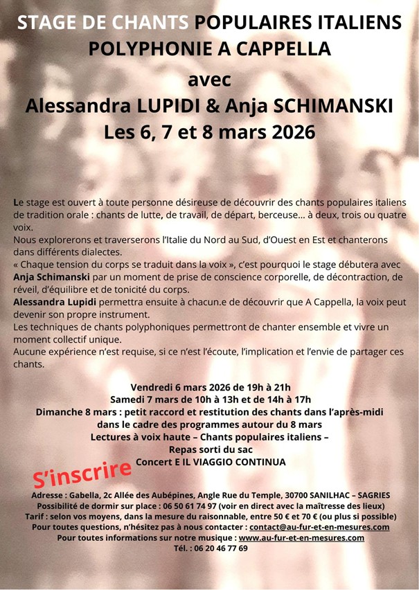 Tout au long de ce voyage, la voix d’Alessandra Lupidi et la contrebasse d’Anja Schimanski se mêlent au jazz, au flamenco, à l’opéra, dans des chants de travail, de lutte, de départ, berceuses, recettes de cuisine, et dans des compositions originales.