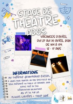 Stage de théâtre ado 66 € L’école municipale des Arts Éric-Turquay, organise un stage de théâtre pour les ados de 12 à 17 ans pendant les vacances d’avril, encadré par Vanessa Mattioli.