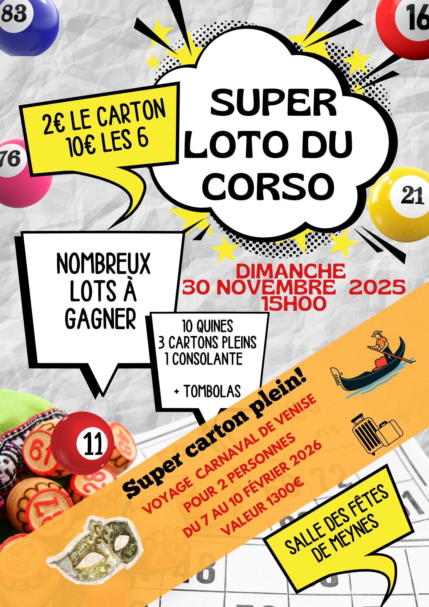 Venez tenter votre chance au Super Loto organisé par le Corso de Meynes ! Quines, cartons pleins et tombolas.Le super gros lot : un voyage pour deux personnes à Venise pour le carnaval 2026 ! Venez soutenir le Corso de Meynes !