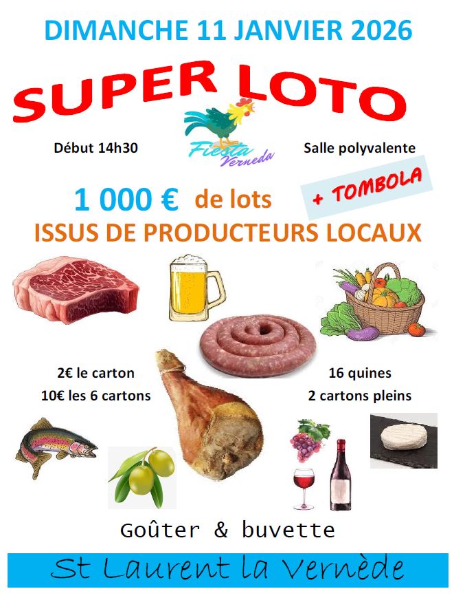 1000 € de lots issus des producteurs locaux à gagner ! L’association Fiesta Verneda organise son Super Loto et une tombola. L’occasion de commencer l’année dans une ambiance conviviale et gourmande en remportant l’un des nombreux de nos producteurs.Goûter et buvette sur place.