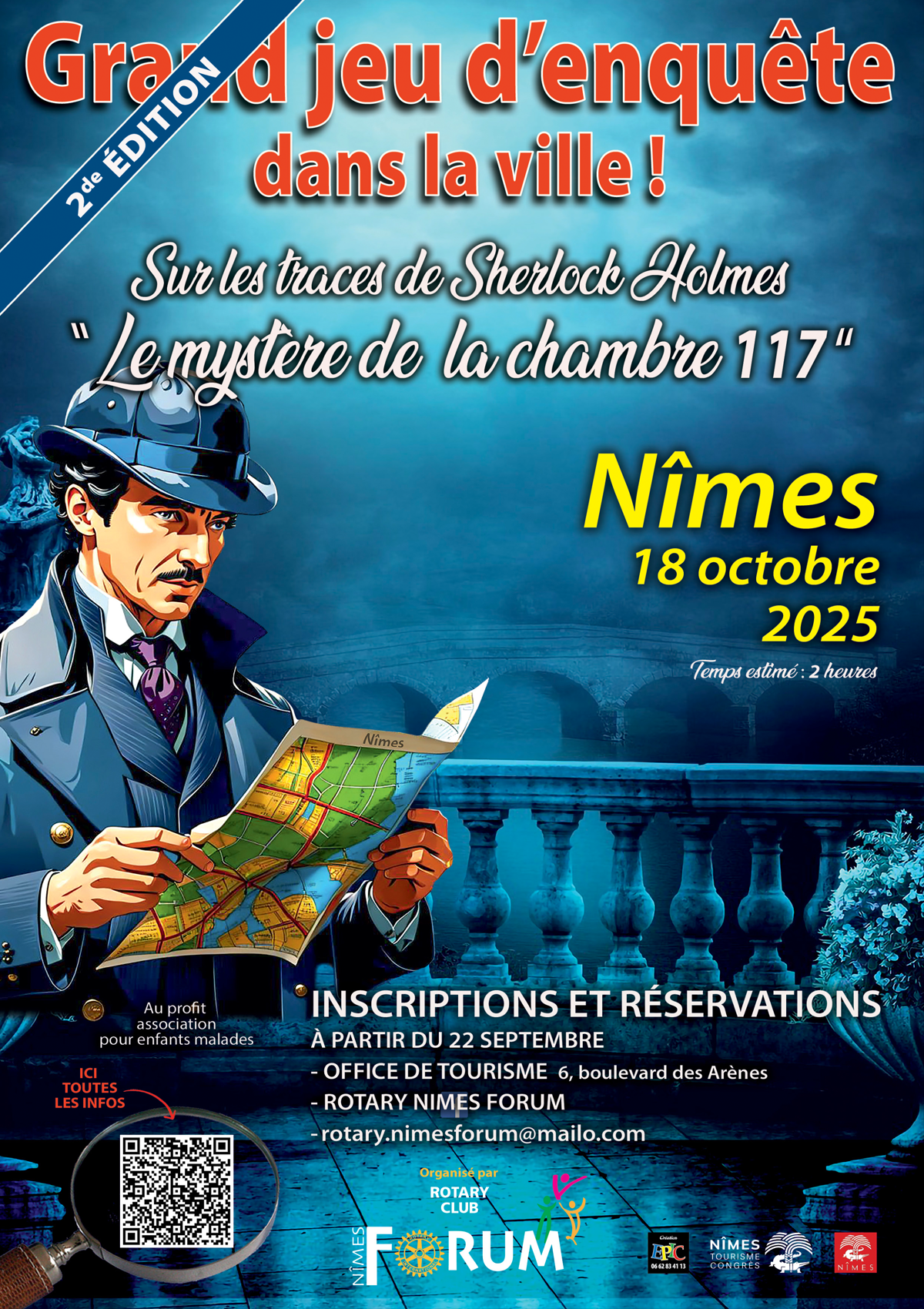 « Nous sommes en 1903 Sherlock Holmes a disparu lors d’un séjour à Nîmes où il suivait une affaire liée à un vol de tableau mystérieux la seule trace retrouvée est une clé de la chambre 117 de l’hôtel du Cheval Blanc avec un message crypté et un journal évoquant des lieux énigmatiques de la villes où seraient dispersés les indices afin d’ouvrir la chambre 117. » Vous deviendrez lors de cette journée une équipe mandatée par Scotland Yard pour retracer les pas de Sherlock Holmes et résoudre le mystère de la chambre 117 qui pourrait conduire à des révélations troublantes sur….Chut on ne vous en dit pas plus rdv le 18 octobre