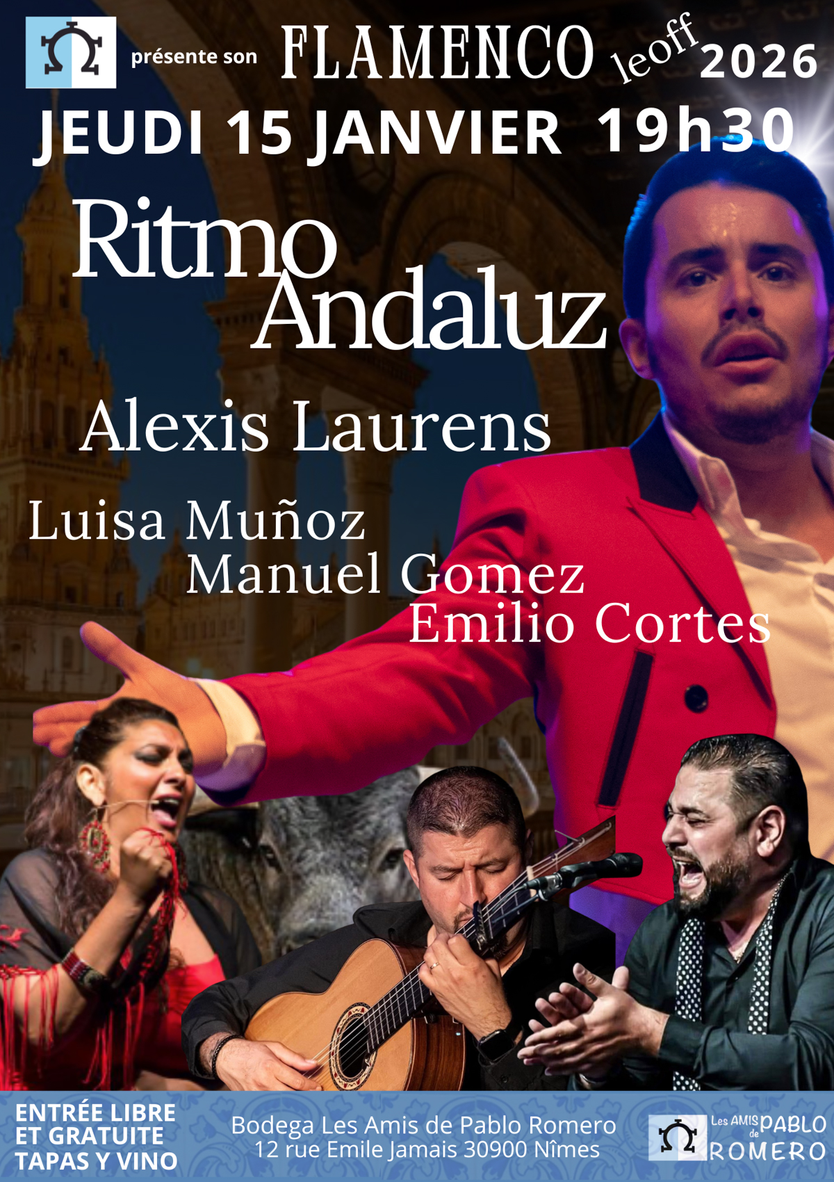 Tablao flamenco à 19h30 à la Bodega Pablo Romero : “Ritmo Andaluz” réunit Alexis Laurens, Manuel Gomez, Emilio Cortés et Luisa Muñoz pour une soirée intense et authentique.