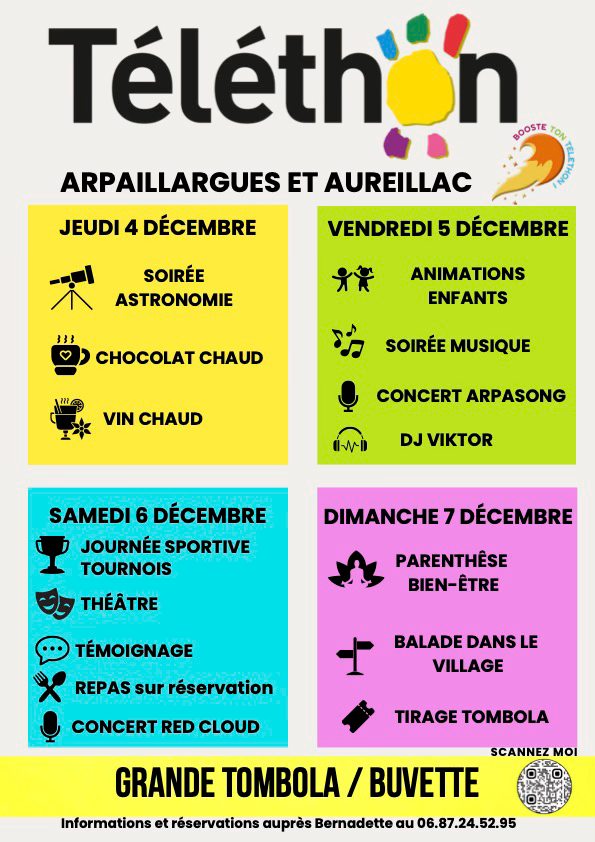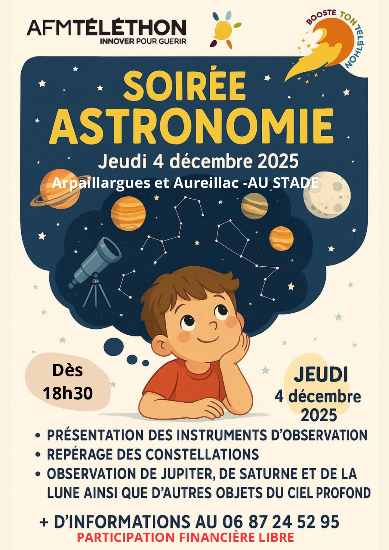 Les associations d’Arpaillargues et Aureillac se mobilisent pendant 4 jours au profit du Téléthon. Un vaste programme oscillant entre observation astronomique, jeux enfants, concerts, sports, théâtre, balade, bien-être, témoignage, repas et vin chaud.