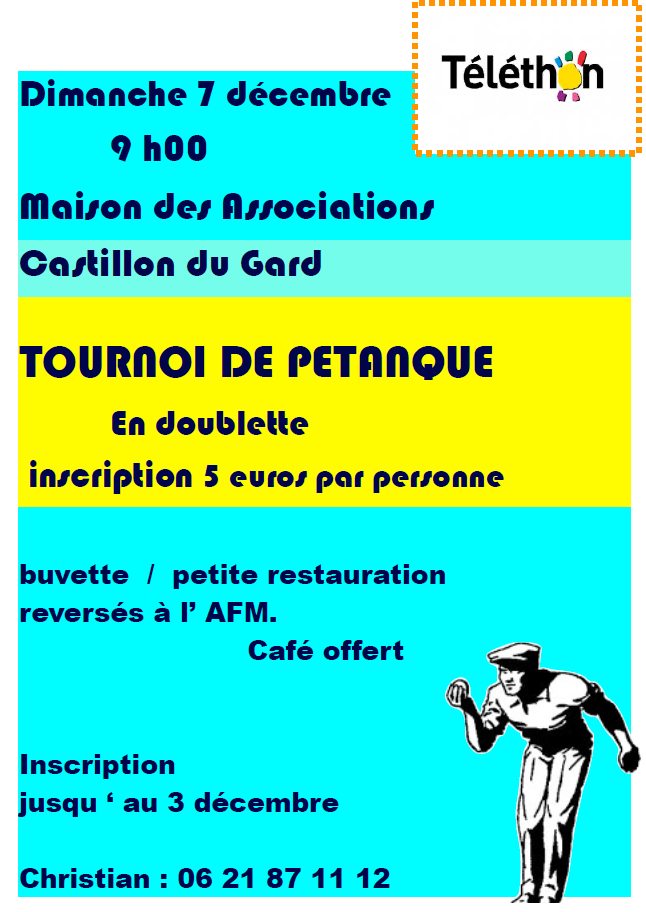Dimanche 7 décembre – 9h : Tournoi de pétanque en doublette, à la maison des associations – 5 € / personne. Inscription auprès de Christian : 06 21 87 11 12