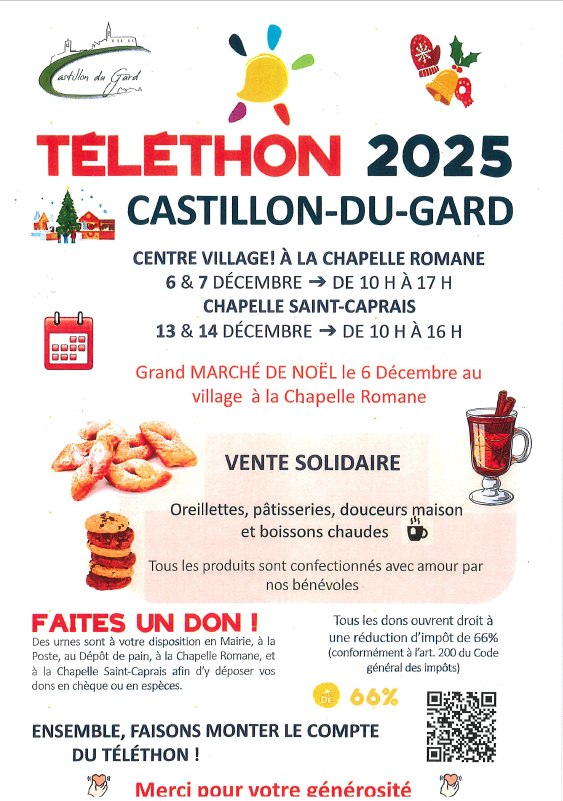 Castillon du Gard organise une vente solidaire au profit du Téléthon : Oreillettes, pâtisseries, douceurs maison et boisson chaudes, confectionnés avec amour par les bénévoles. Participez également au tournoi de pétanque pour faire monter le compte.