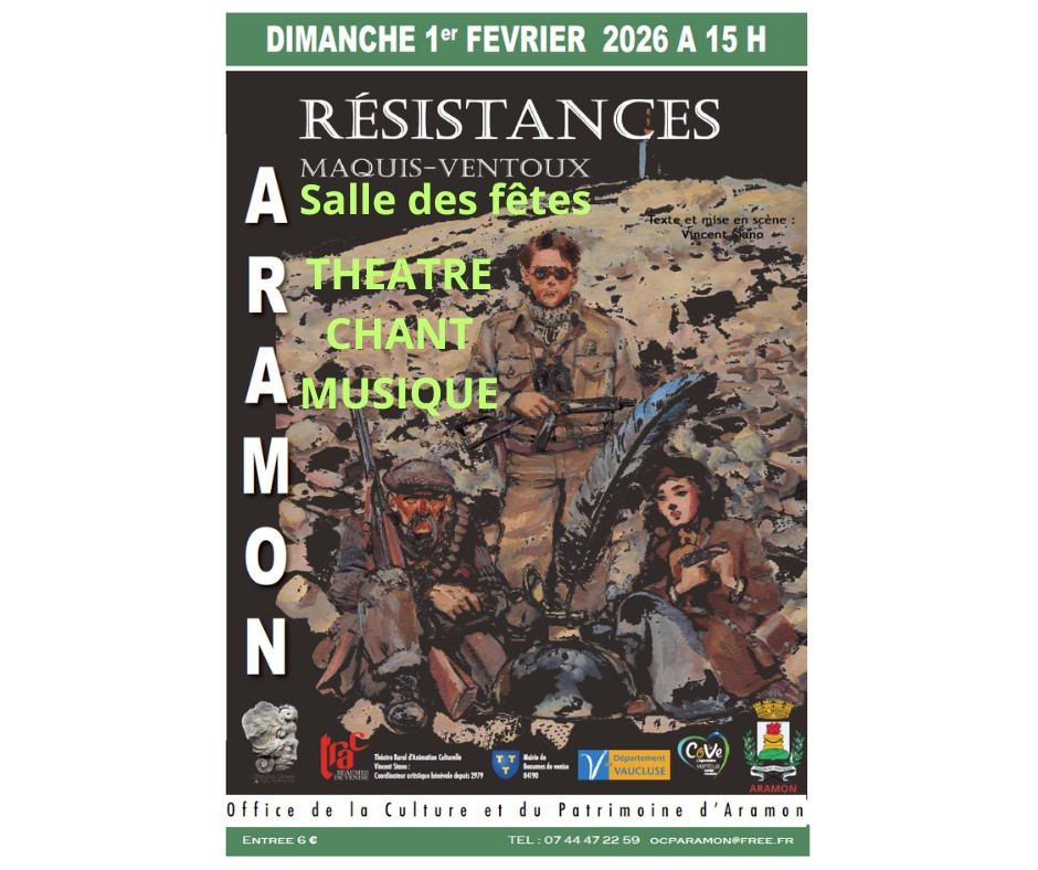 La troupe TRAC de Beaumes de Venise viendra nous présenter sa création, Résistance Maquis Ventoux, un spectacle alliant le théâtre, le chant et la musique. Les comédiens racontent la naissance du Maquis Ventoux en 1942 et 1944.