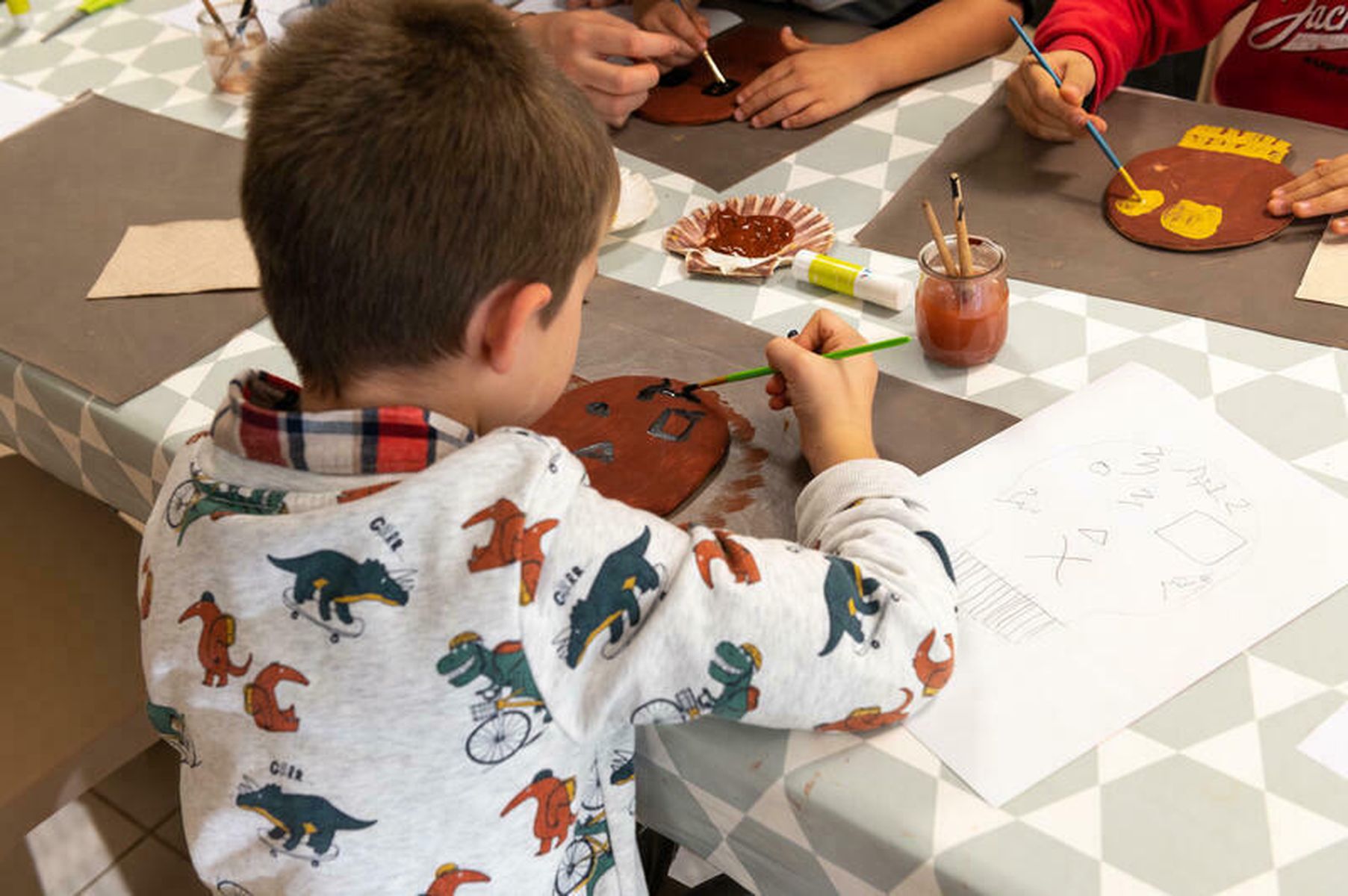 Des ateliers créatifs invitent les enfants à découvrir l’art préhistorique à travers le modelage, le dessin, la gravure et la création de masques.