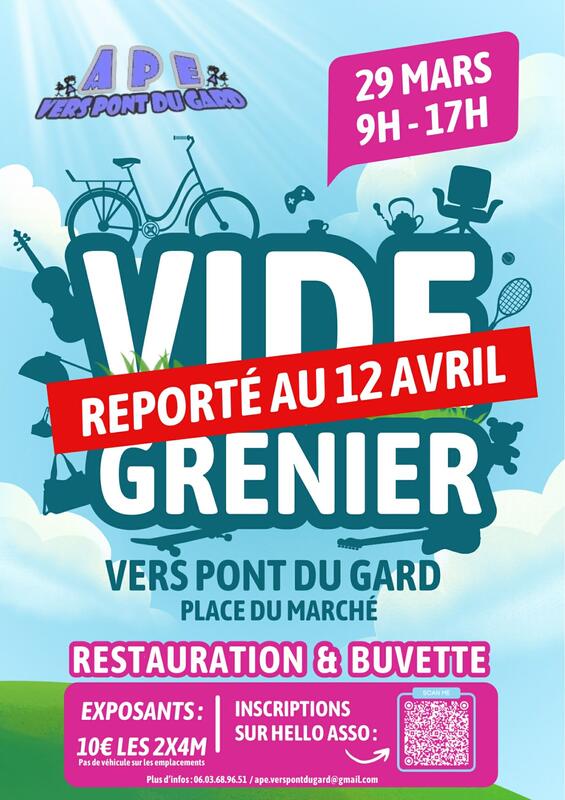 L’APE de Vers vous convie à son vide-grenier sur la place du marché du village : l’occasion rêvée de vendre les objets dont on n’a plus l’usage et d’en acquérir d’autres qui feront votre bonheur ou celui de votre entourage.