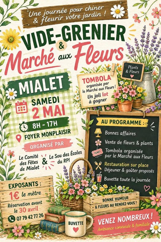 Une journée pour chiner et fleurir votre jardin à Mialet, avec un vide-grenier et un marché aux fleurs. Au programme : bonnes affaires, vente de fleurs et plants, tombola, restauration sur place et buvette toute la journée.