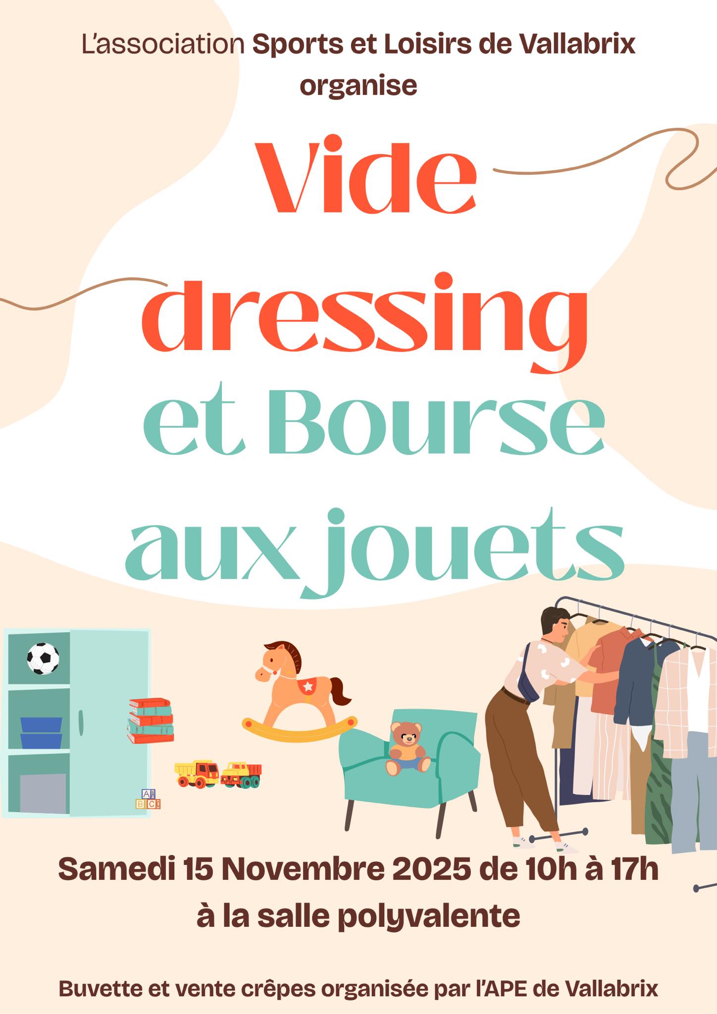 L’association Sports et Loisirs organise un vide grenier et une bourse aux jouets. Venez chiner de bonnes affaires !Buvette et ventes de crêpes par l’APE de Vallabrix.