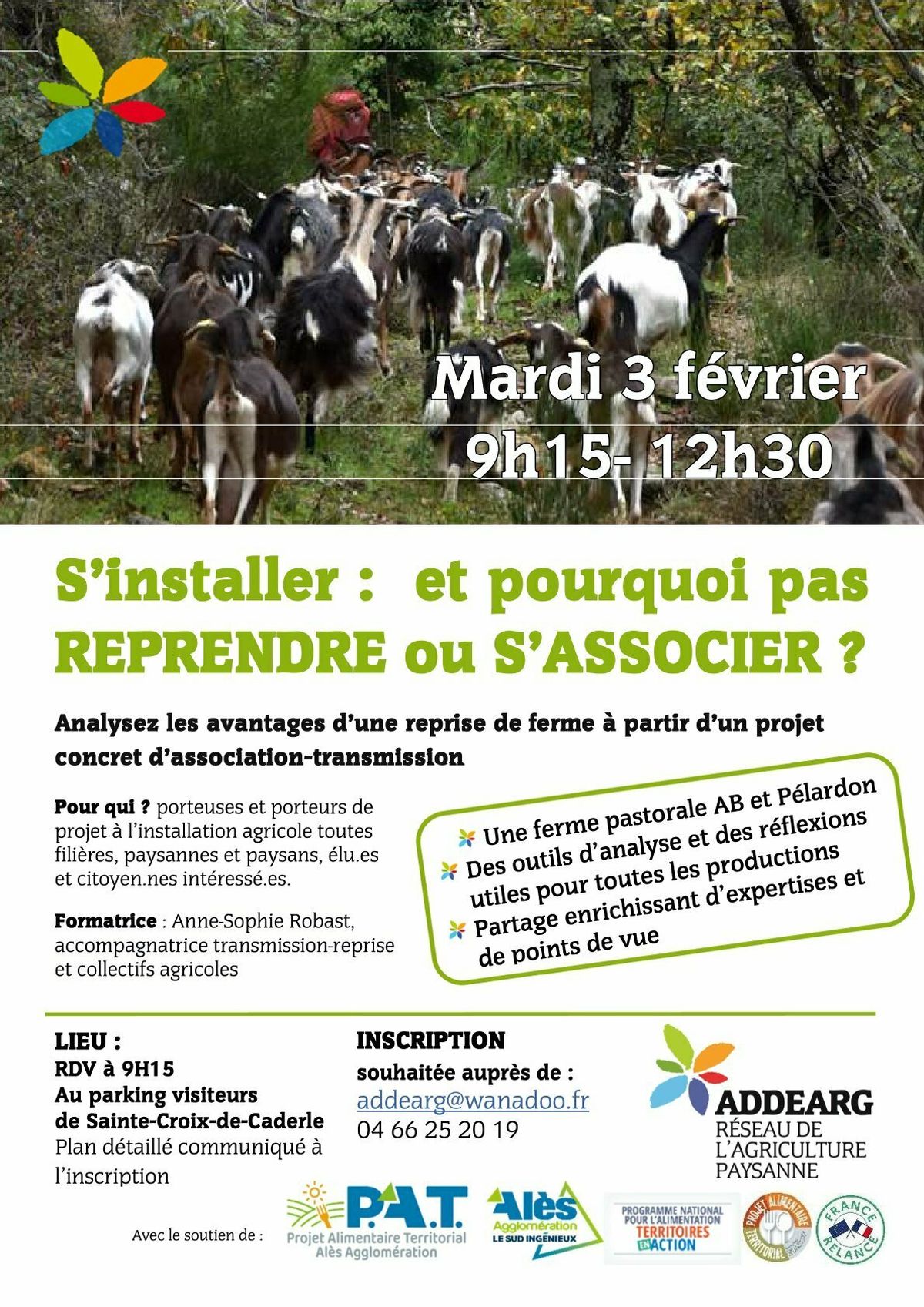 L’Addearg vous invite à une visite de ferme pour analyser les avantages d’une reprise de ferme à partir d’un projet concret d’association-transmission : – Une ferme pastorale AB et Pélardon – Des outils d’analyse et des réflexions utiles pour toutes les productions – Partage enrichissant d’expertise et de points de vue