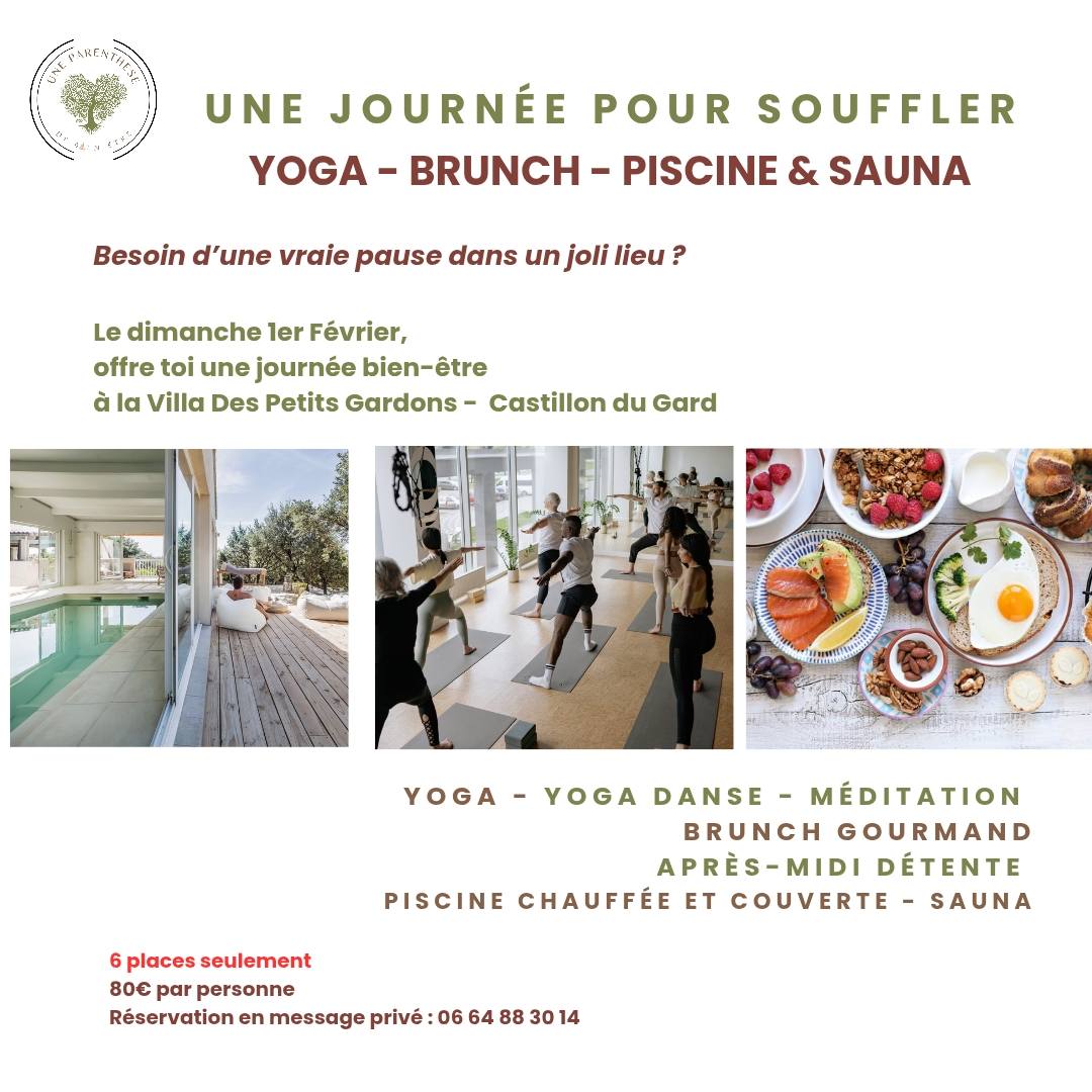 « Une Parenthèse de bien-être » vous propose une journée complète rien que pour vous ! Yoga, yoga danse, brunch sain et coloré, piscine chauffée et couverte et sauna. Tout sera là pour relâcher les tensions, reconnecter votre corps et votre esprit !