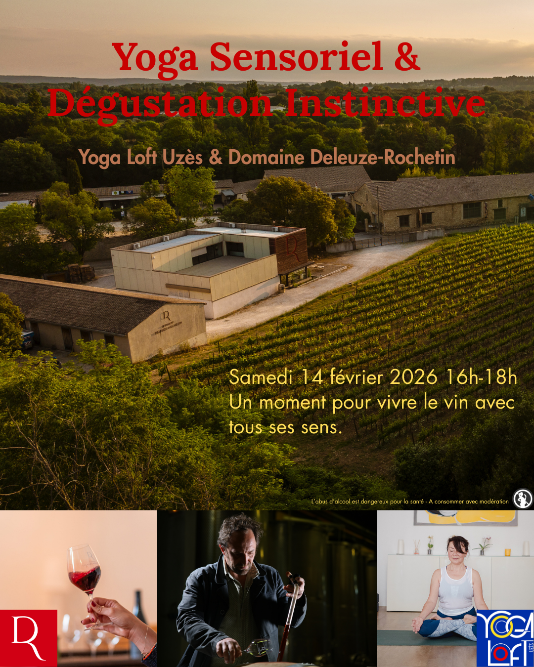 Yoga Loft Uzès s’associe au Domaine Deleuze-Rochetin pour proposer une expérience sensorielle unique, au cœur du vignoble.Un atelier mêlant yoga sensoriel les yeux fermés, doux et accessible à tous, et dégustation instinctive des vins du domaine.