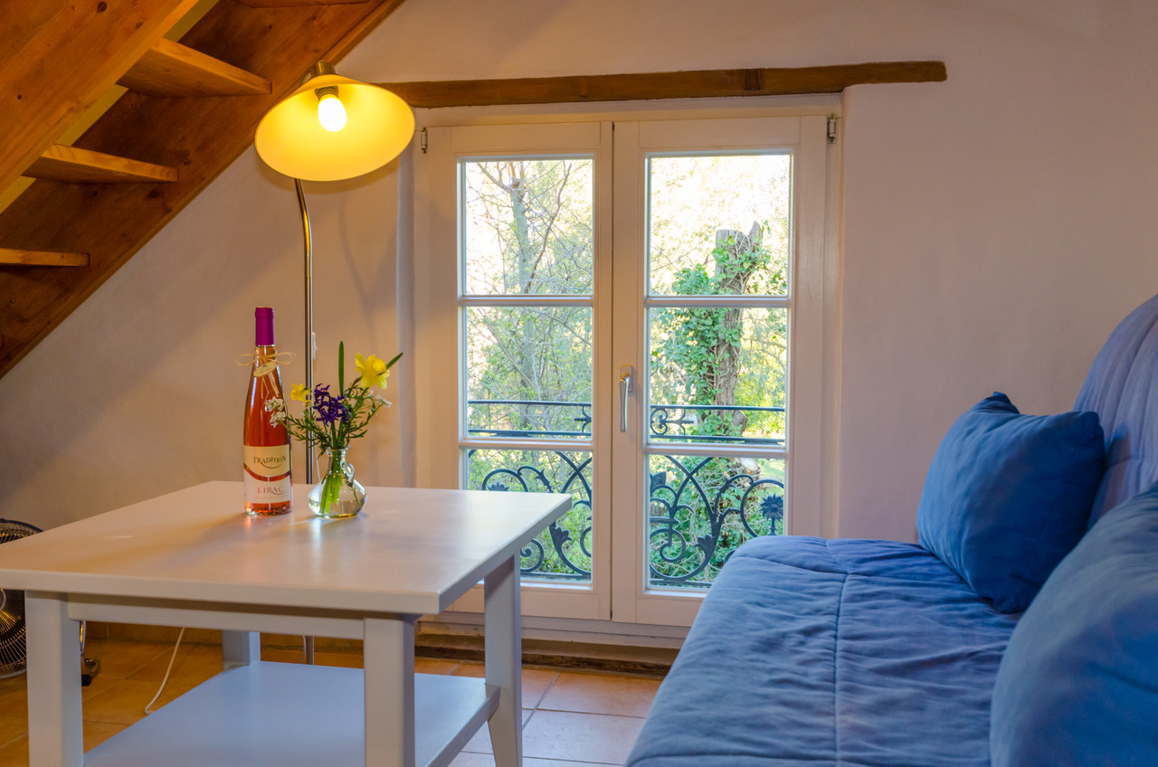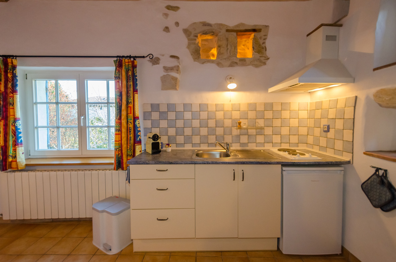 Ce studio se trouve dans une vieille grange, que nous avons transformée, au prix de long et minutieux travaux, en un original logement de vacances sur deux niveaux. Vous trouverez au rez-de-chaussée le séjour et la cuisine. Un escalier en bois permet d’accéder à la mezzanine où est installé le lit double.