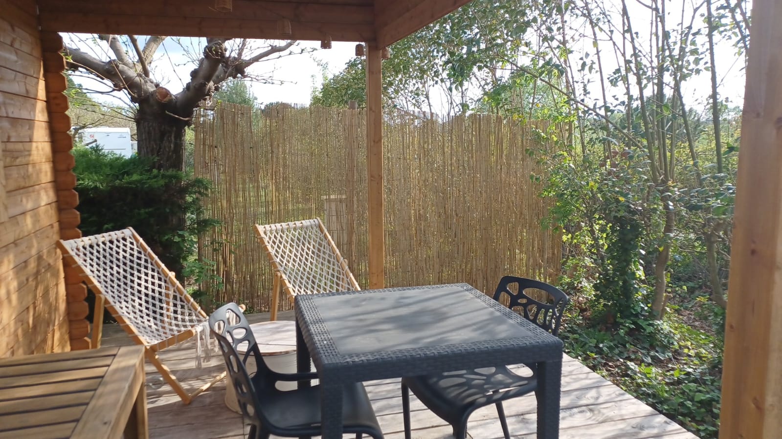 À l’extérieur, la terrasse couverte de 5 m², montée sur pilotis, vous invite à profiter des beaux jours : table de jardin, réchaud à gaz pour vos repas, deux transats bohème pour paresser et une guirlande lumineuse pour prolonger la douceur des soirées.