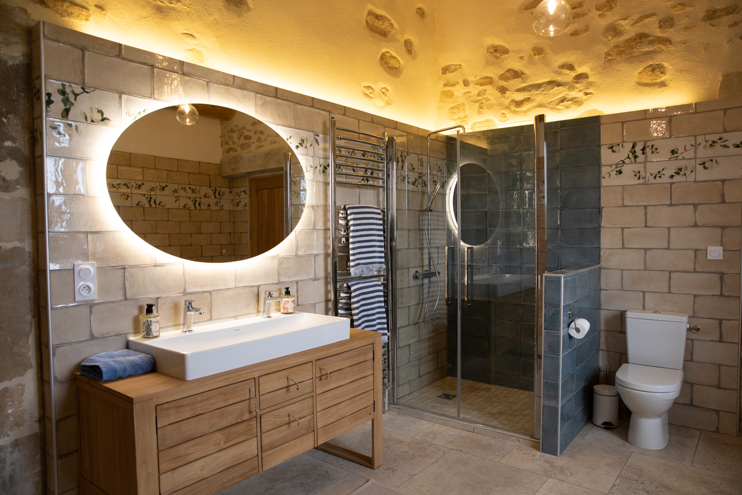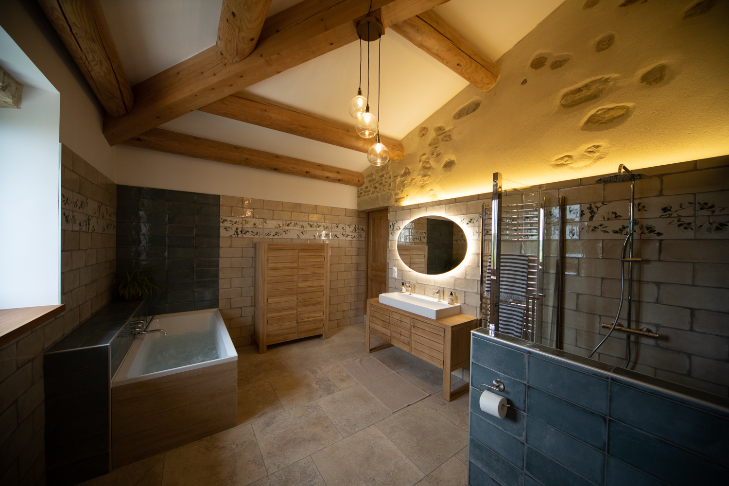 Découvrez notre magnifique suite de 2-5pers sur un site exclusif et naturel avec des vues imprenables sur les paysages forestiers et le Mont Ventoux. Sur une superficie de 90m² entièrement rénové dans le respect de la pierre et du bois, le logement propose deux grandes chambres, avec une chambre principale de 30 m² et vue sur le Mont Ventoux, une chambre secondaire de 16 m² et vue dégagée sur la forêt, une grande salle de bain de 15 m² (douche, bain balnéo, WC, vasques) et une toilette séparée. L’entrée est individuelle et privée.