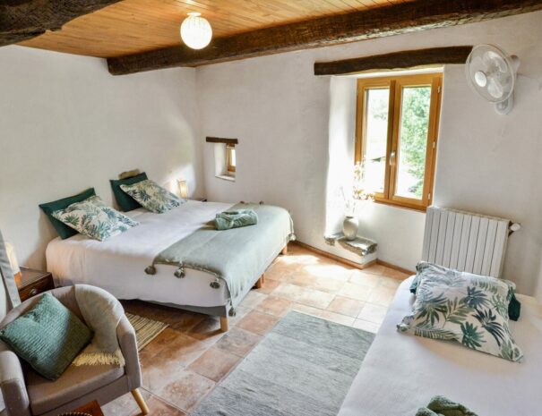 Une belle suite indépendante, au 1er étage (sans ascenseur) de une ancienne magnanerie, constituée de 2 chambres et 2 salles de bain, et entièrement rénovée en 2022.