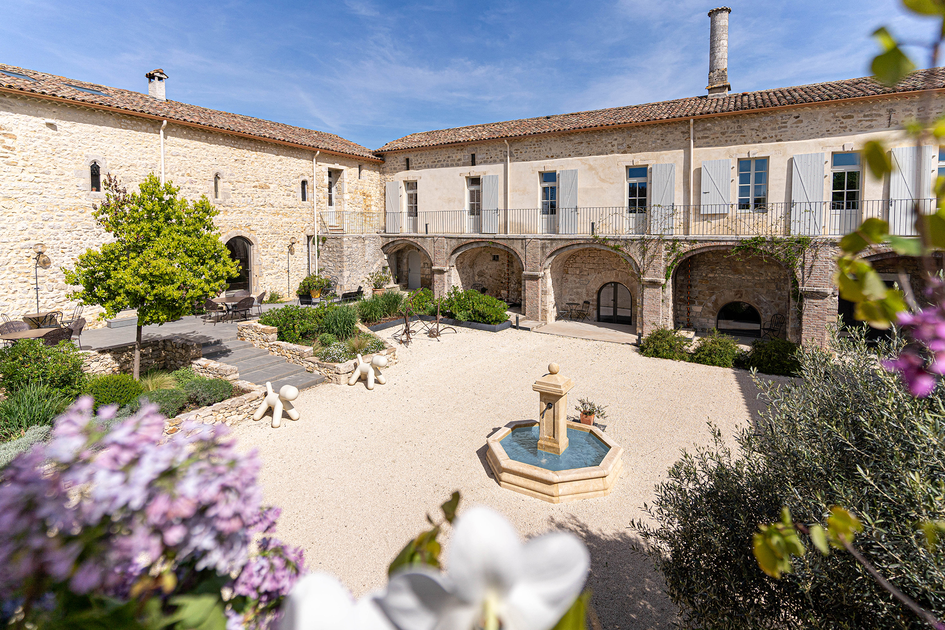 Avec sa fontaine centrale, la cour est le cœur de la vie au domaine donnant accès à la salle à manger et sa grande terrasse, au préau abrité du soleil (et d’une éventuelle ondée), au salon, à la salle de réception et aux chambres d’hôtes situées à l’étage. Avec sa végétation méditerranéenne, elle est le cadre idéal pour rêver, lire, se détendre, prendre le petit déjeuner, boire un verre…