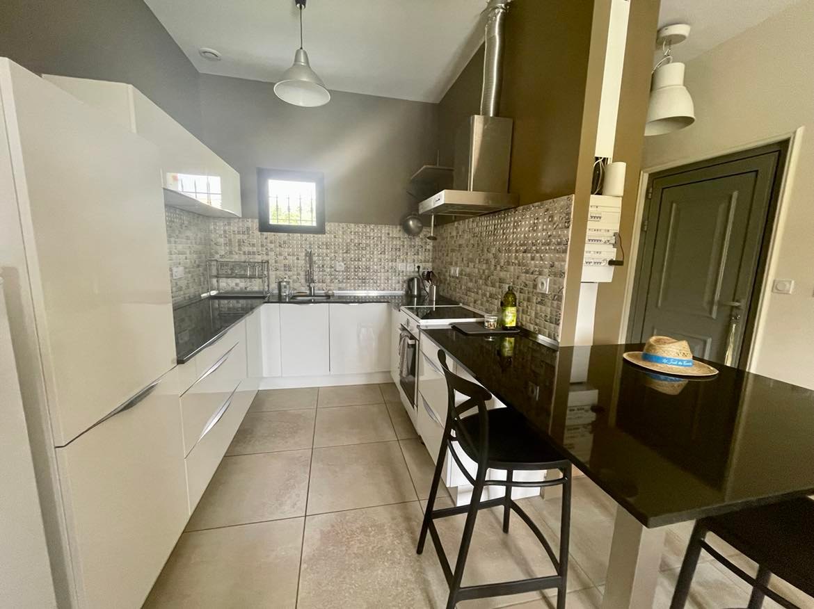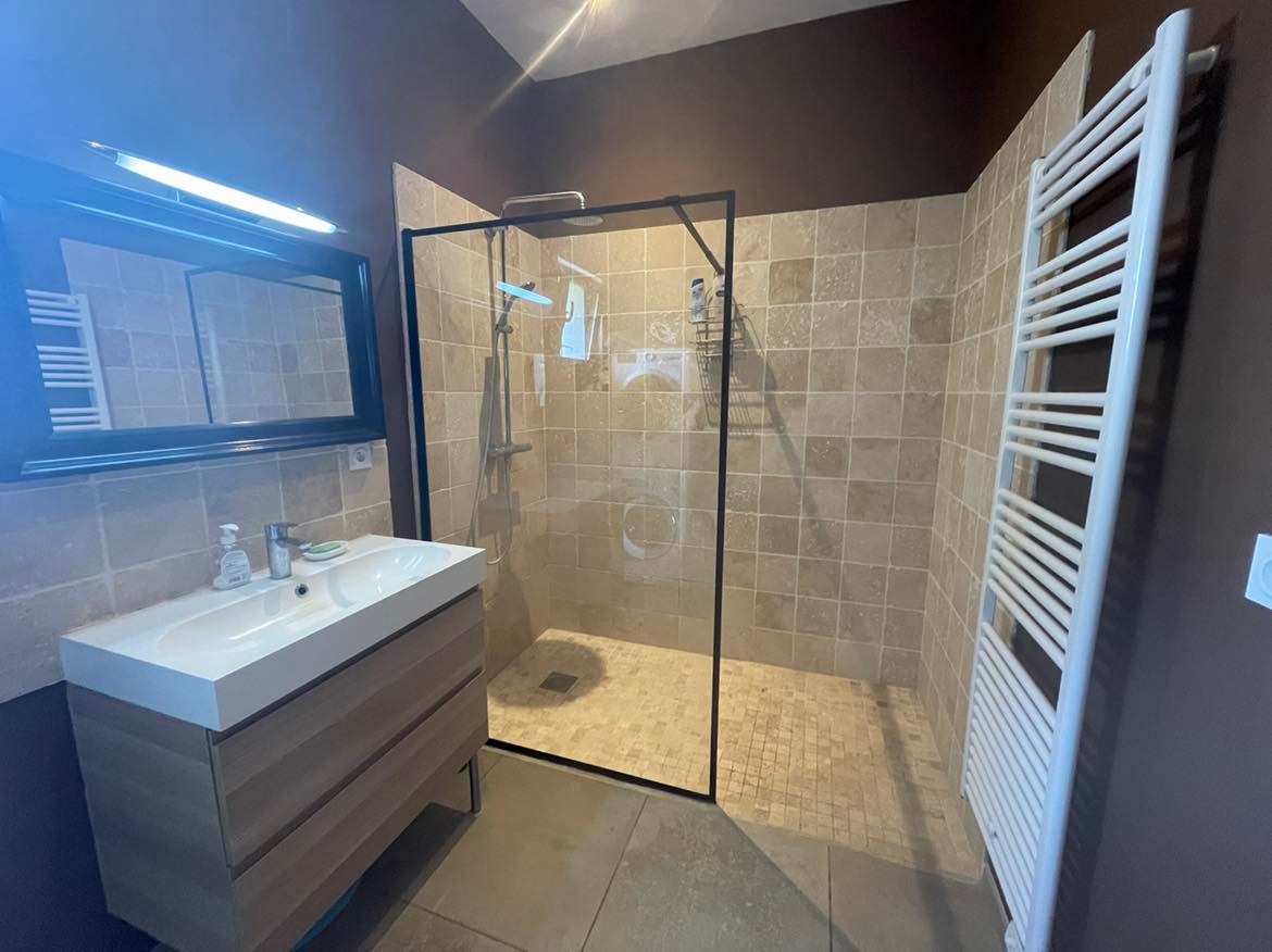 Cet appartement de plain-pied a été aménagé avec soin et offre des prestations de qualité : travertin, plafond en parefeuille et de beaux volumes avec une hauteur sous plafond de 3 mètres. Il comprend une cuisine équipée ouverte sur le salon, une chambre avec lit à baldaquin ainsi qu’une salle d’eau dotée d’une douche à l’italienne.
