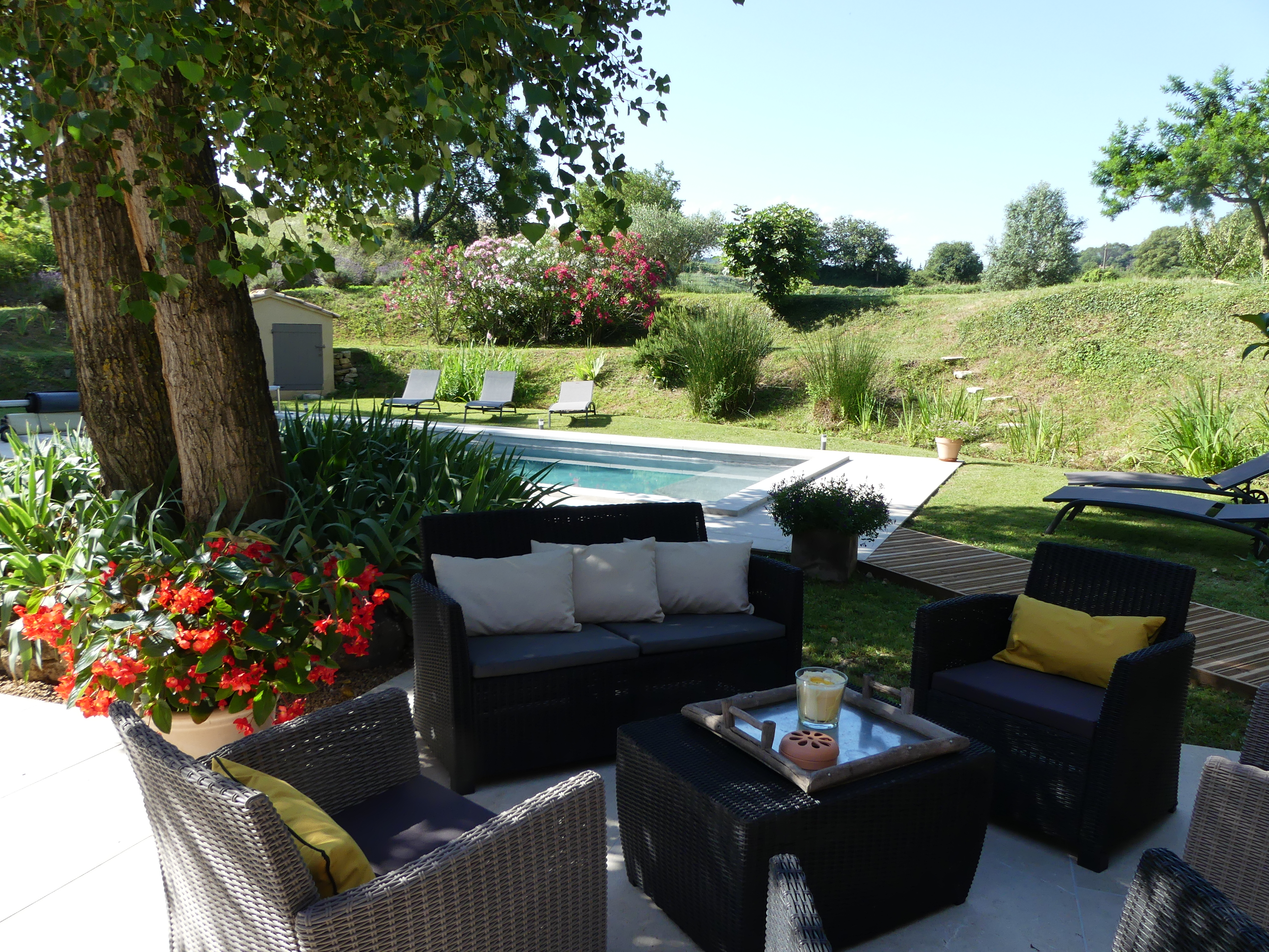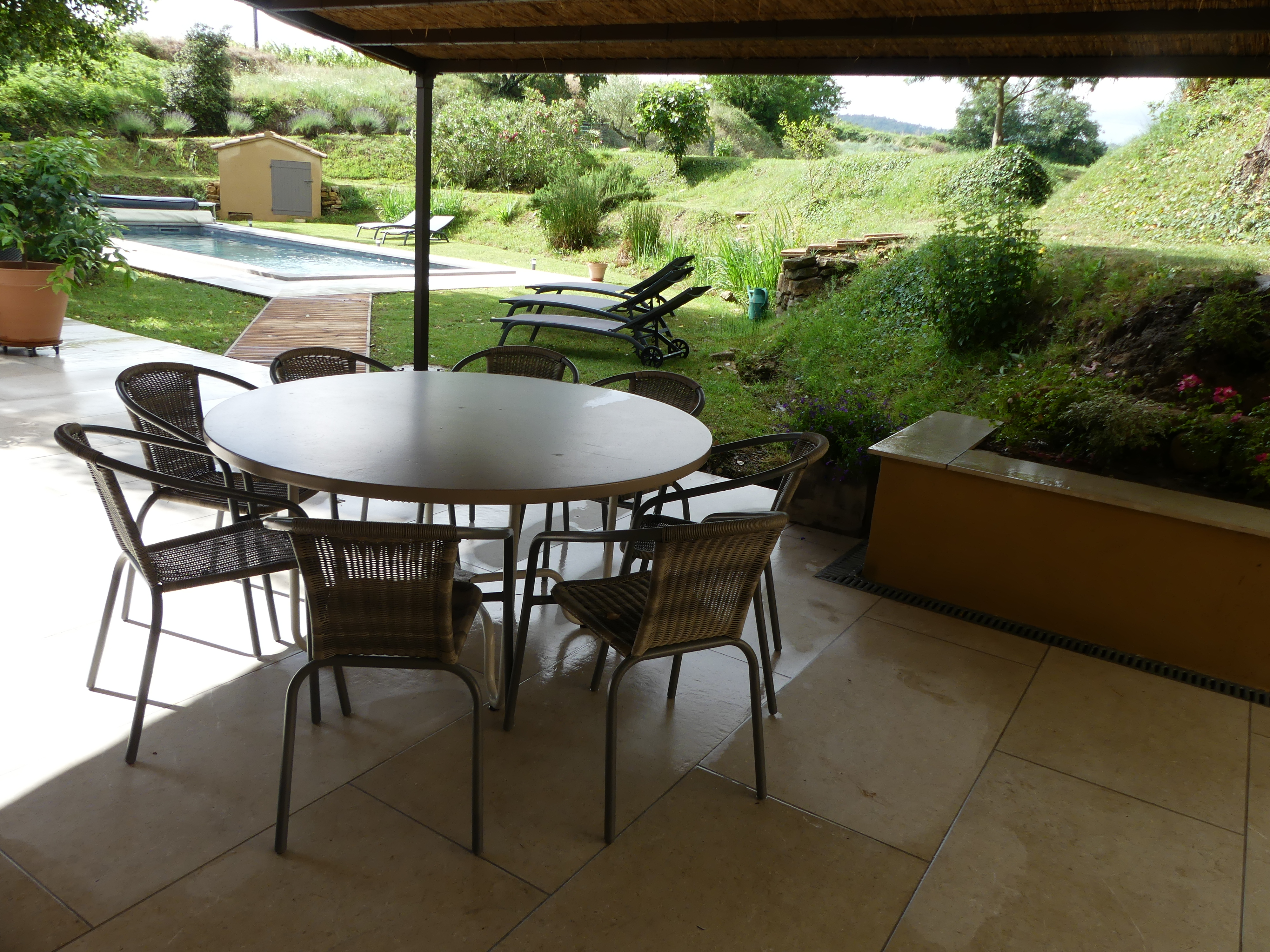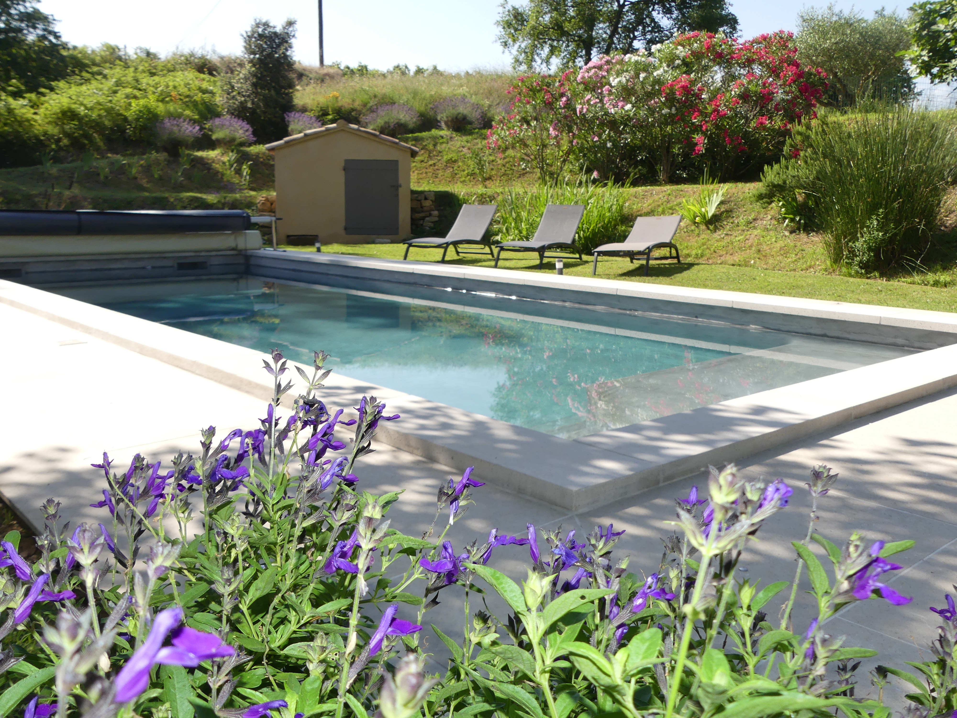 Piscine de 3,50mx9m avec plage immergée, sécurité enfant bâche à barres. Passage d’une personne 3 fois par semaine pour l’entretien de la piscine. Transats autour de la piscine.