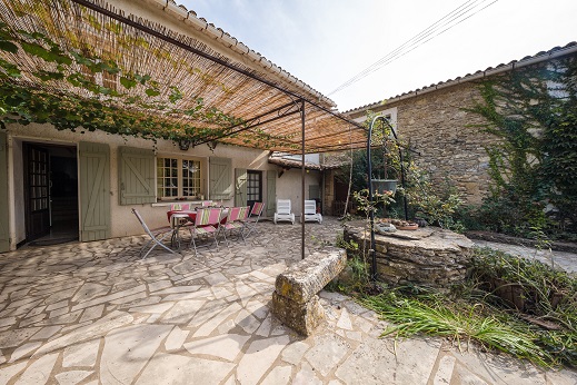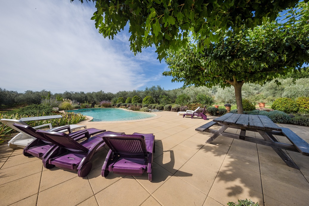Charmante maison de campagne au calme, au cœur des vignes de la vallée du Rhône, avec piscine dans un jardin soigné et verdoyant.