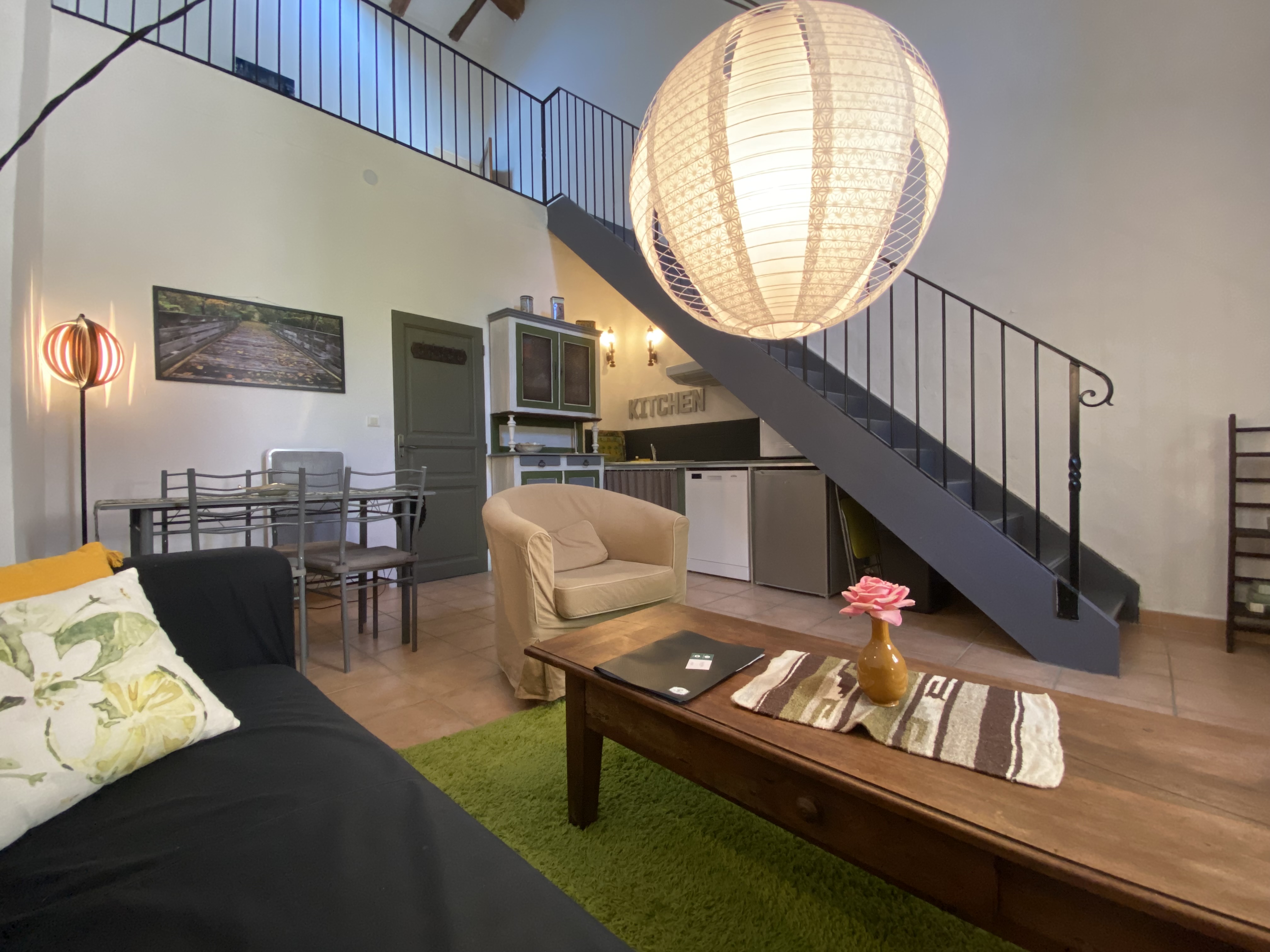 L’oranger : grand appartement de 120 m² pour 6 personnes avec galerie dans un loft sur 2 étages. Au 1er étage, salon spacieux avec poêle, coin repas et cuisine entièrement équipée, balcon privé ; au 2ème étage, 2 chambres, grande salle de bain moderne, sur la galerie un coin lecture et 1 lit simple sur la mezzanine.