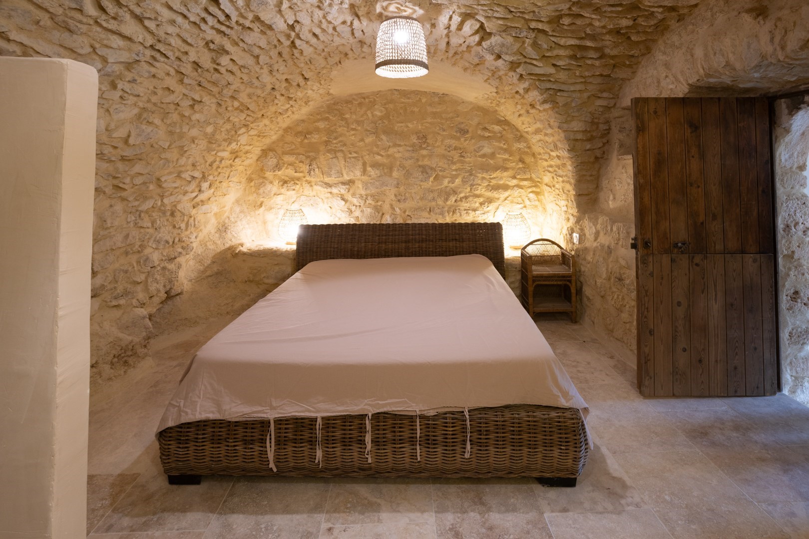 Sa pièce de vie comprend un espace repas, une kitchenette ainsi qu’un canapé-lit. La suite, entièrement voûtée et en pierre, offre une atmosphère paisible et naturellement fraîche, parfaite pour les chaudes journées d’été. Le gîte bénéficie également d’un jardin privé, équipé de mobilier de jardin.