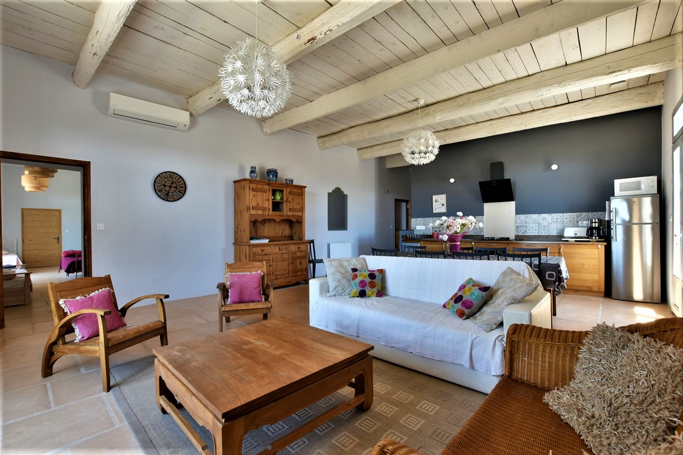 Le grand gîte est situé à l’étage du Mas. Il est accessible par une entrée indépendante (à l’opposé du lieu de vie des propriétaires et de la chambre d’hôtes/suite familiale).