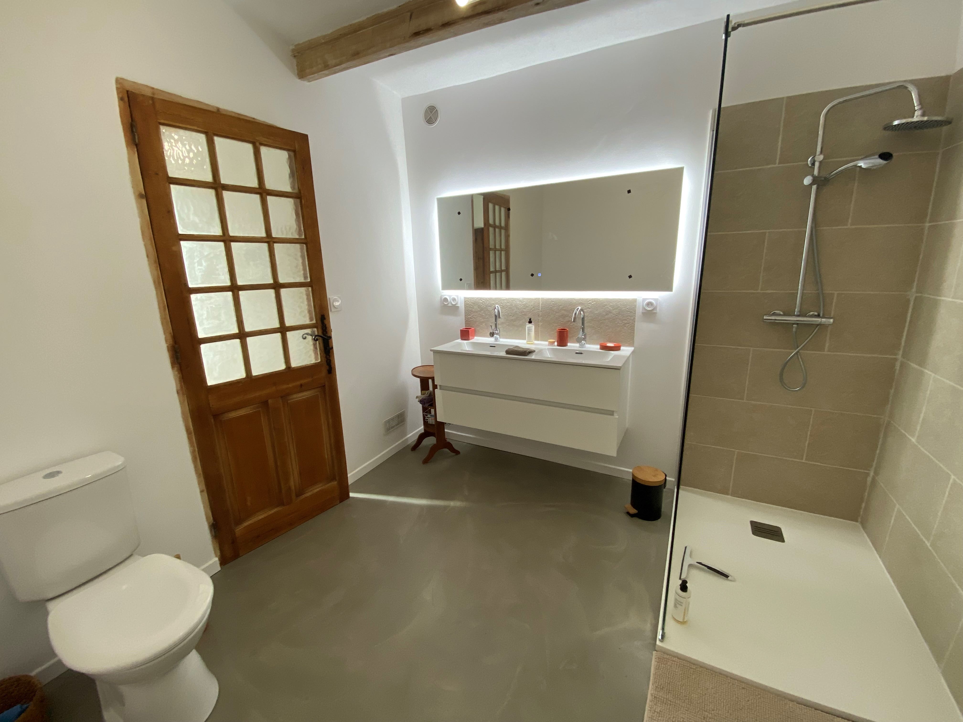 – de 2 salles de bains : 1 au rez-de-chaussée, douche à l’italienne, machine à laver le linge, avec les toilettes séparées et 1 à l’étage, douche à l’italienne avec les toilettes