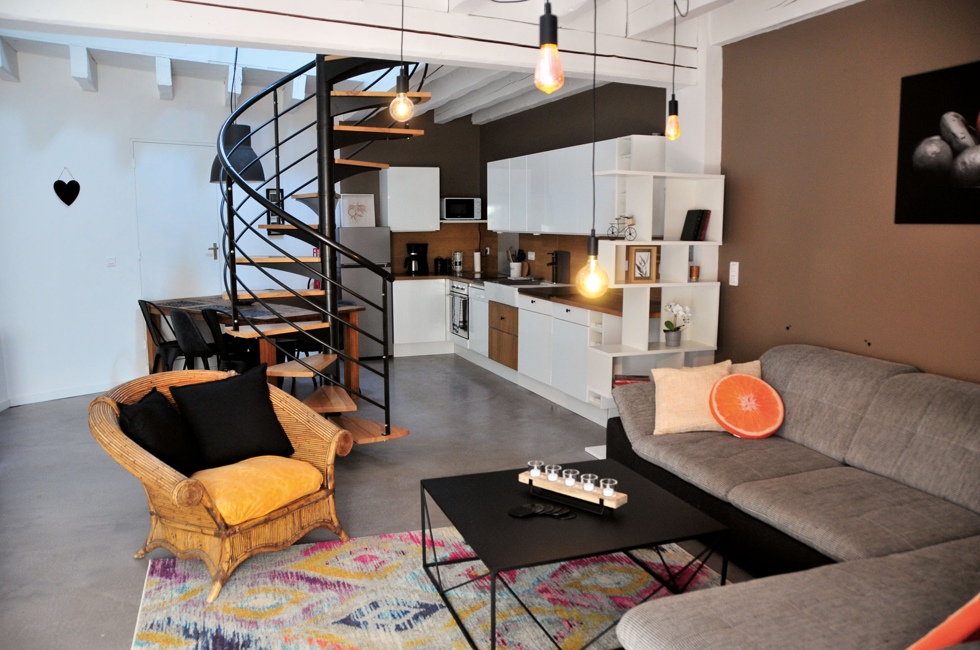 L’oranger : grand appartement de 120 m² pour 6 personnes avec galerie dans un loft sur 2 étages. Au 1er étage, salon spacieux avec poêle, coin repas et cuisine entièrement équipée, balcon privé ; au 2ème étage, 2 chambres, grande salle de bain moderne, sur la galerie un coin lecture et 1 lit simple sur la mezzanine.