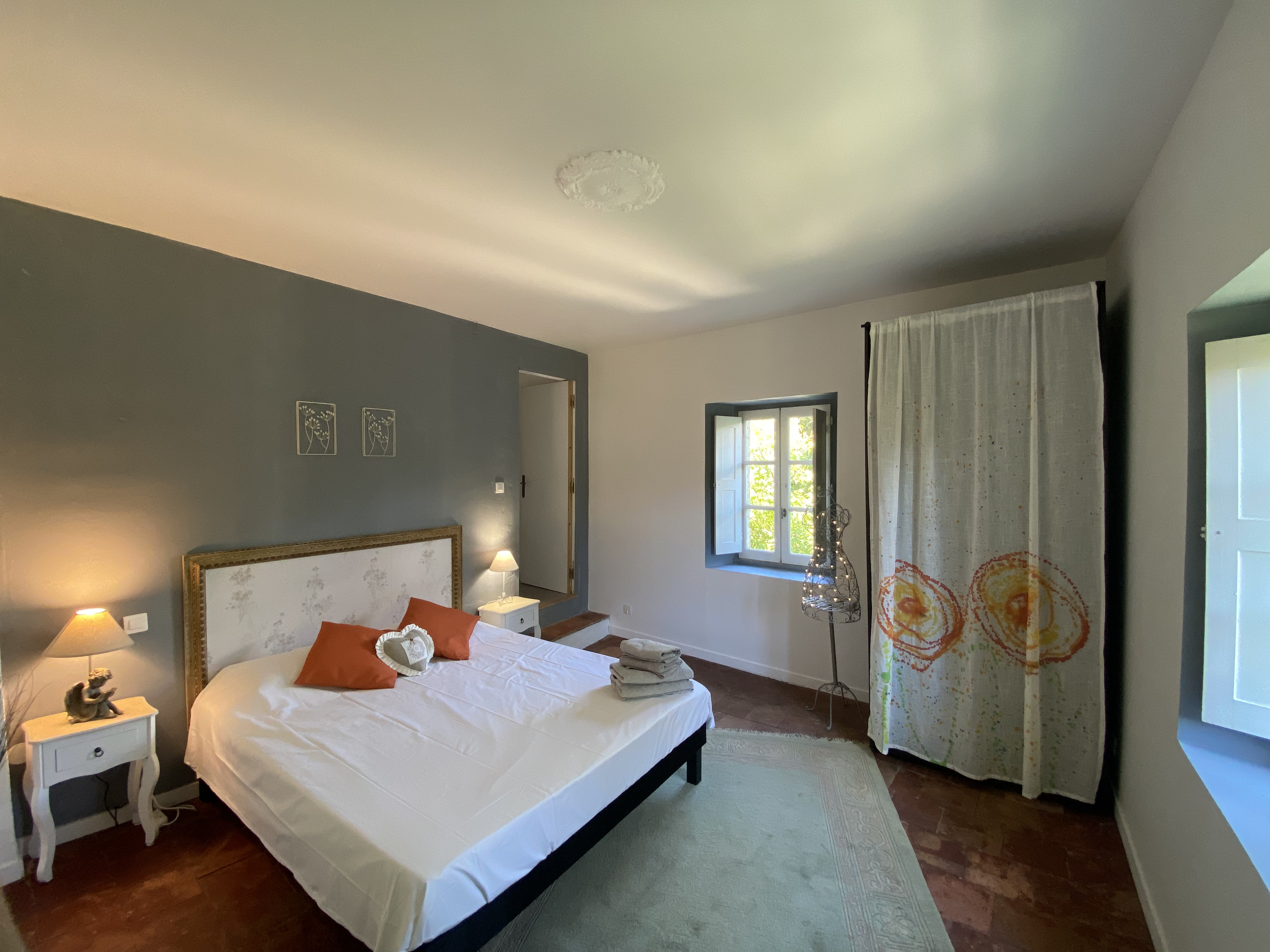 Le Mandarinier : grand appartement pour 6 personnes sur 3 niveaux dans le bâtiment historique des écuries. Au rez-de-chaussée : espace ouvert avec salon, salle à manger avec poêle, une cuisine entièrement équipée, salle de bain et wc séparés. Au 2ème étage, 1 chambre et salle de bain attenante et au dernier étage 3 lits simples et un petit bureau.