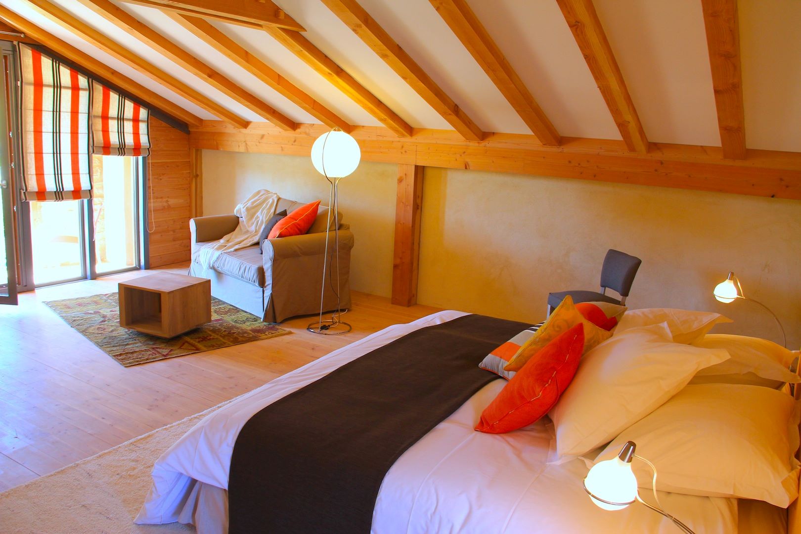 Au premier étage, la vaste chambre parentale, avec lit king size et coin salon avec canapé convertible, ouvre sur le balcon et sa vue imprenable sur le bassin, l’oliveraie et la forêt.