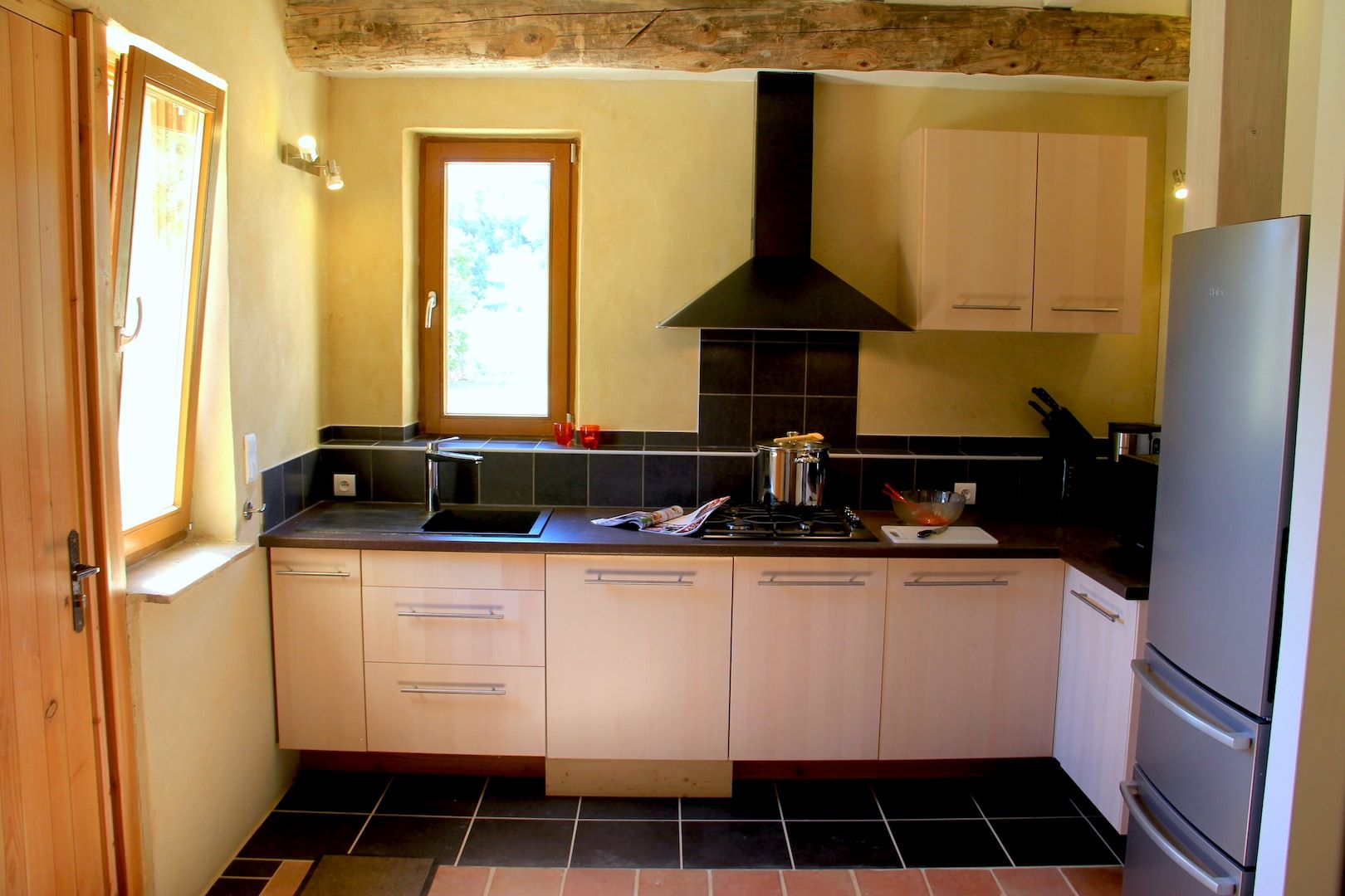 Au rez-de-chaussée se trouvent une cuisine très bien équipée ouvrant sur la salle de séjour : un espace salon avec l’agrément d’un confortable canapé convertible (en deux lits simples 80×200), grand buffet et télévision, un poêle à bois pour les mois plus frais, et une grande table à manger près de la baie vitrée donnant sur la terrasse privative et végétalisée.