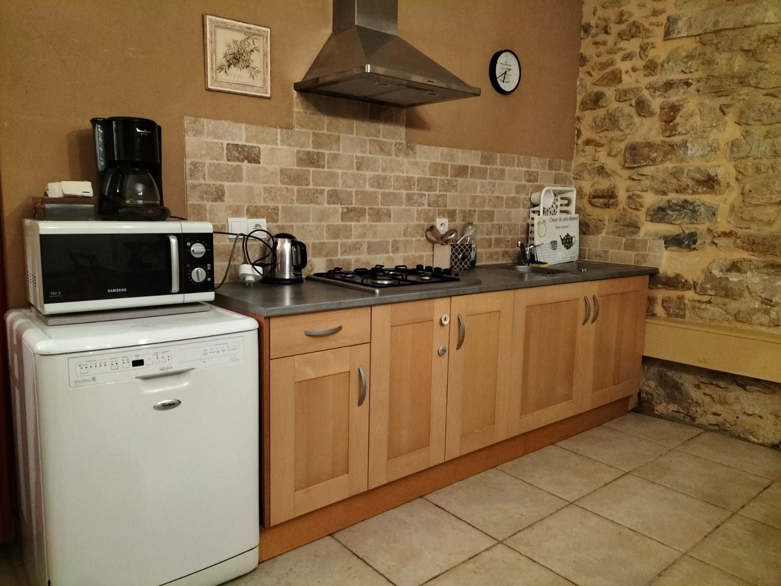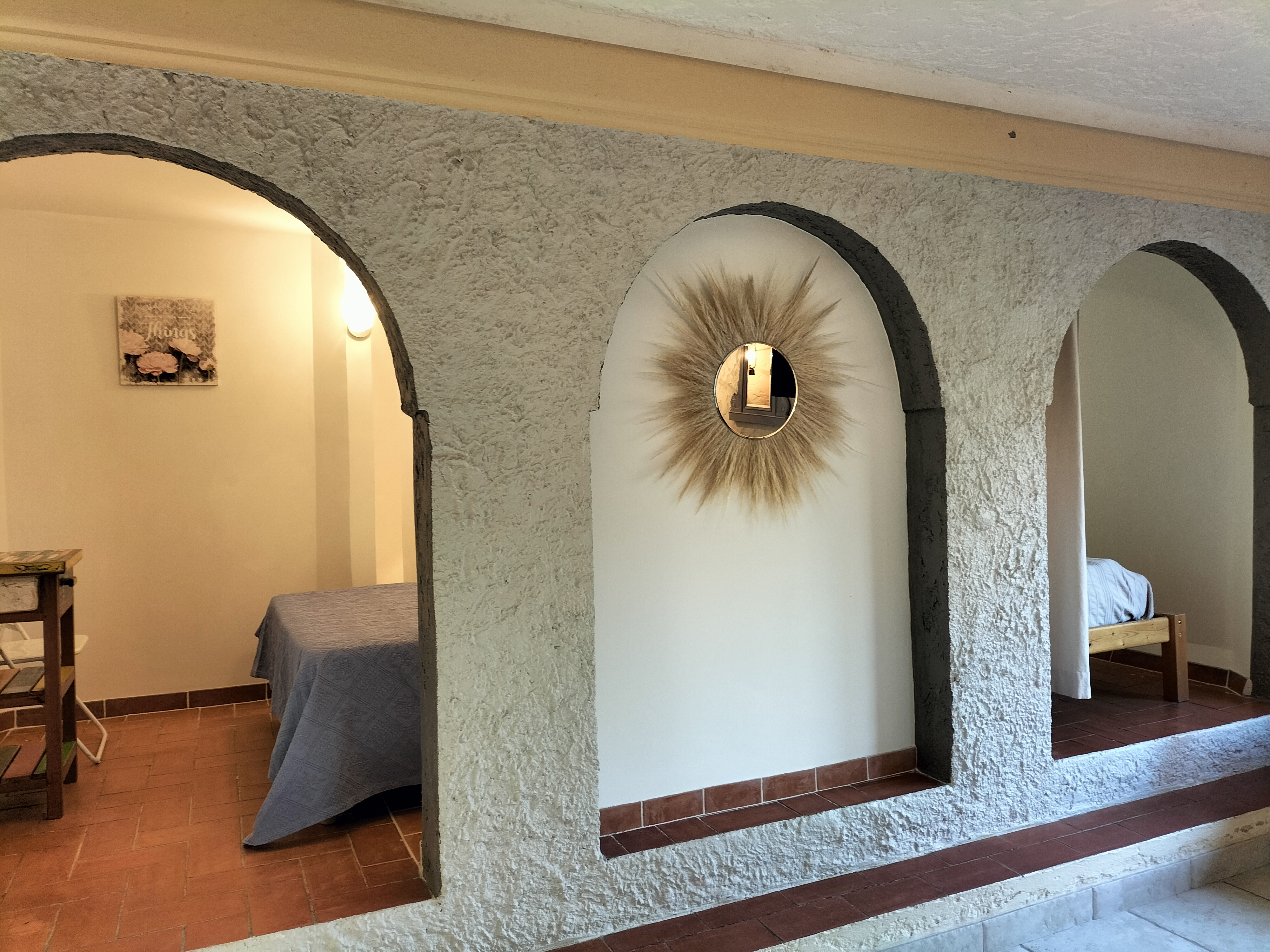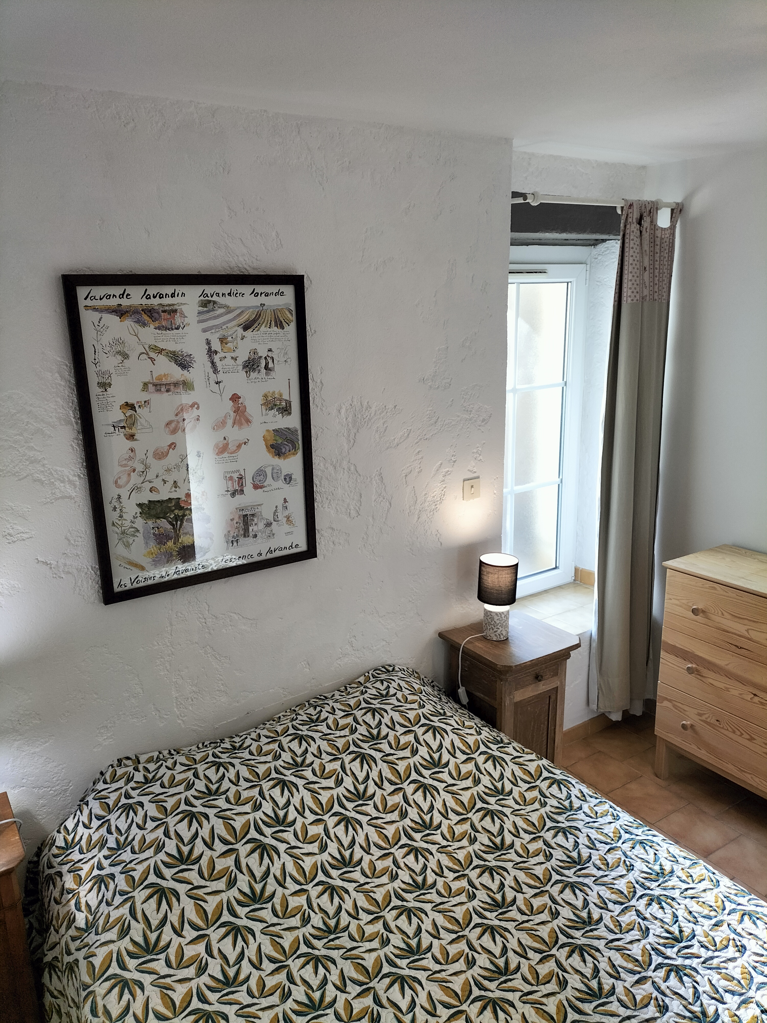 Le gîte Romarin est composé d’une chambre avec un lit en 140 cm, de une alcôve avec 1 lit en 90 cm et une alcôve avec un lit en 140cm, d’une cuisine équipée ouverte donnant sur un séjour équipée d’un clic-clac en 140. Il y a également une salle de bain avec un lavabo, une douche et des toilettes séparées.