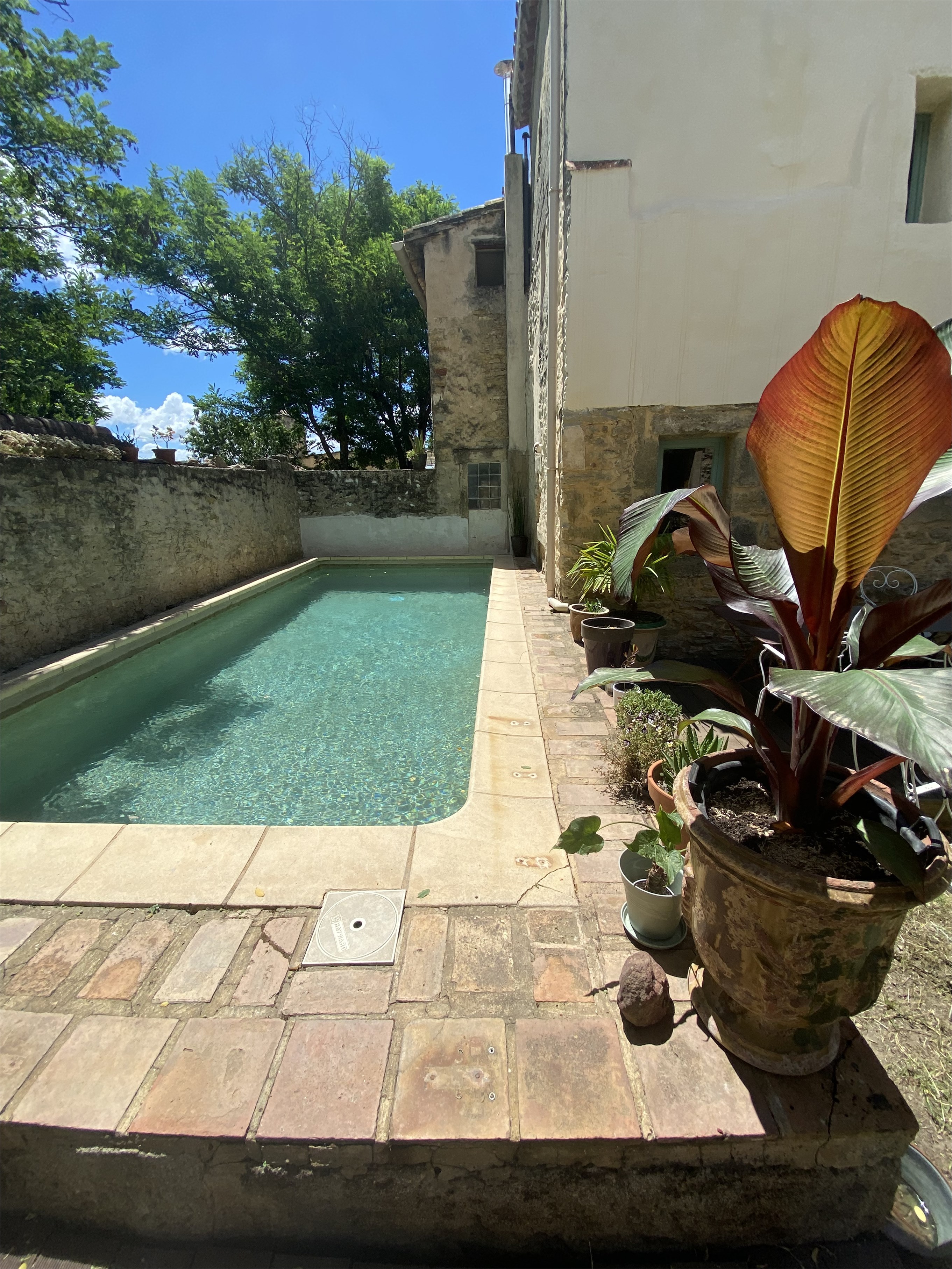 Le petit jardin accueille le coin repas et le bassin de 3m sur 7 ainsi qu un salon de jardin et chaises longues.
