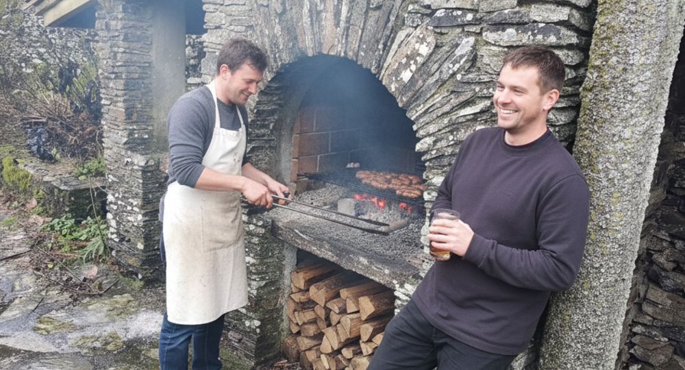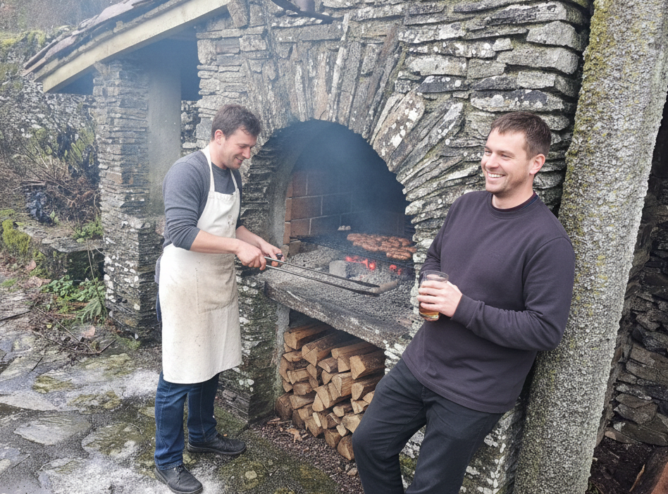 Terrasse panoramique : Surplombant la rivière, équipée de grandes tables et d’un barbecue au feu de bois.