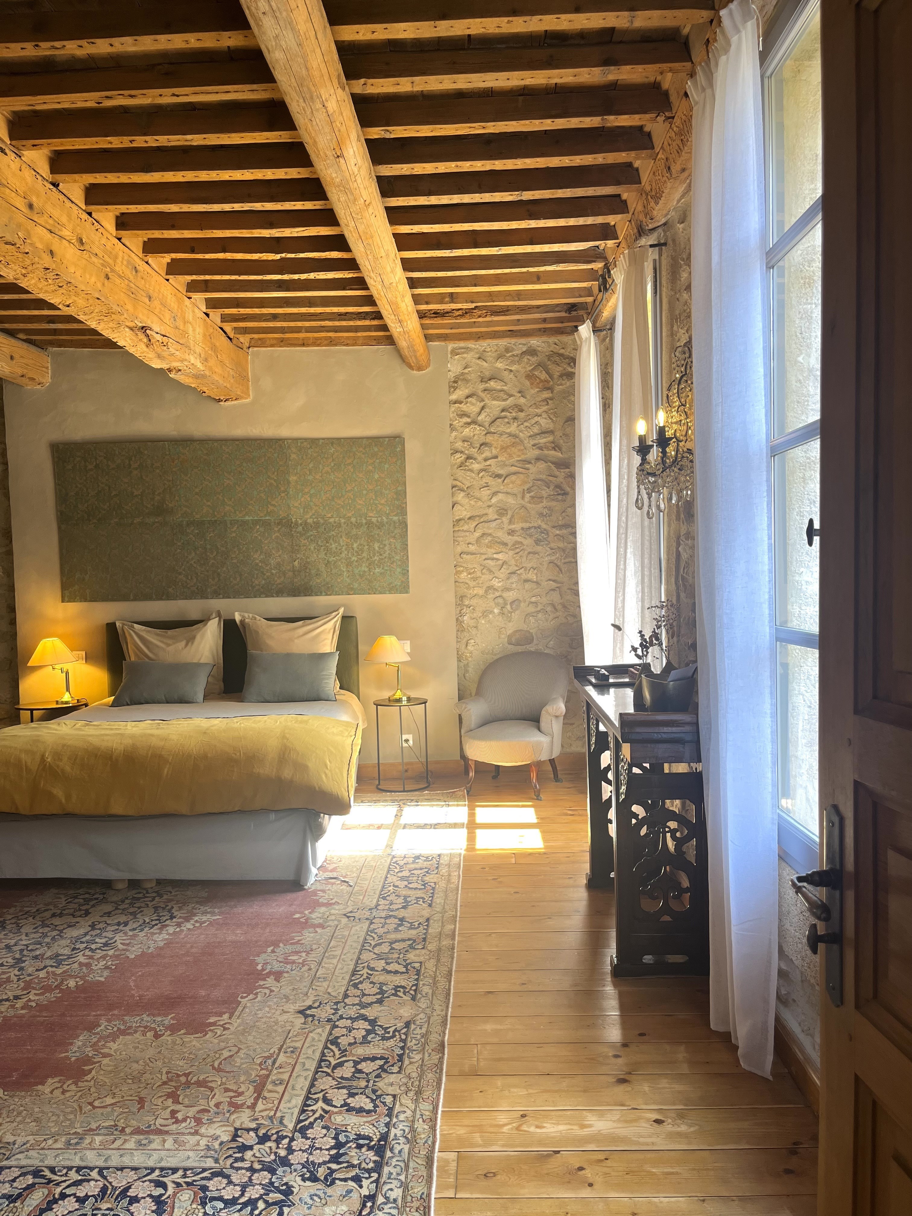 La chambre « COMMANDERIE » de 20m2 avec son grand balcon donnant aussi sur l’eglise.