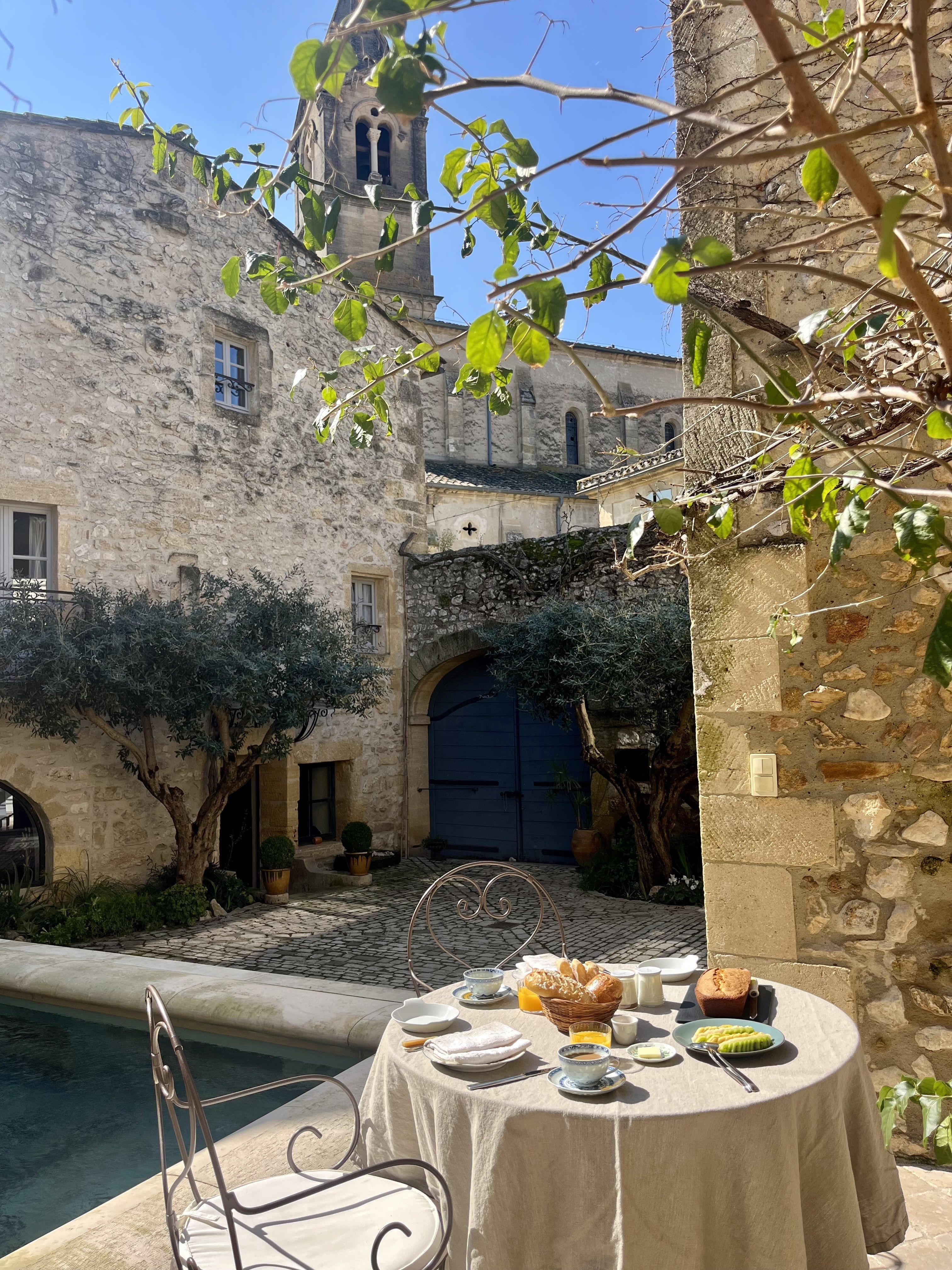 La cour protégée de ses hauts murs de pierre seche, où nous vous servirons le petit déjeuner à l’ombre des oliviers au bord du bassin.