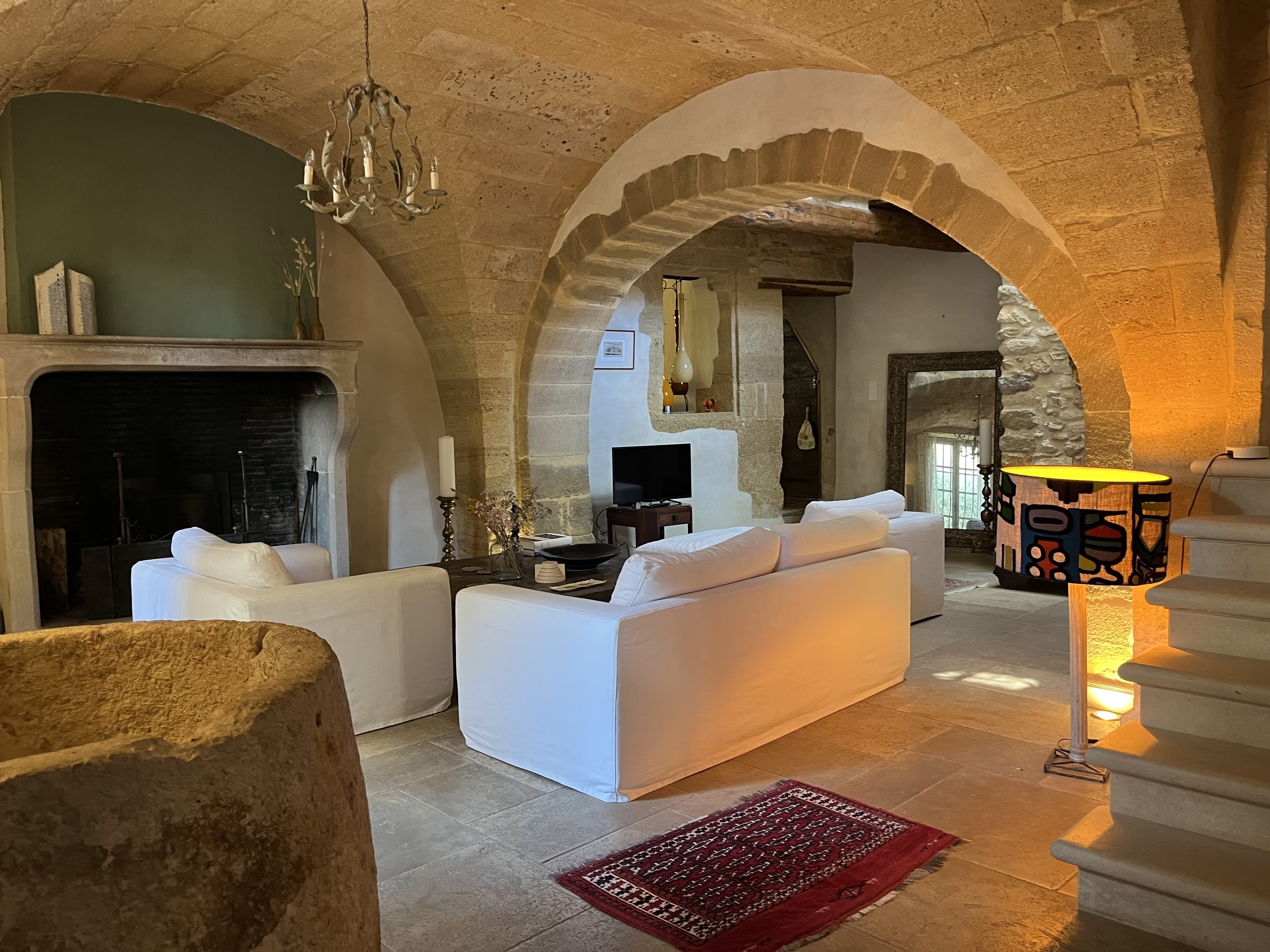 Dans une ambiance cosy, bien au frais, le grand salon vouté est idéal pour lire en toute tranquillité, prendre un verre ou bien encore regarder la télévision.