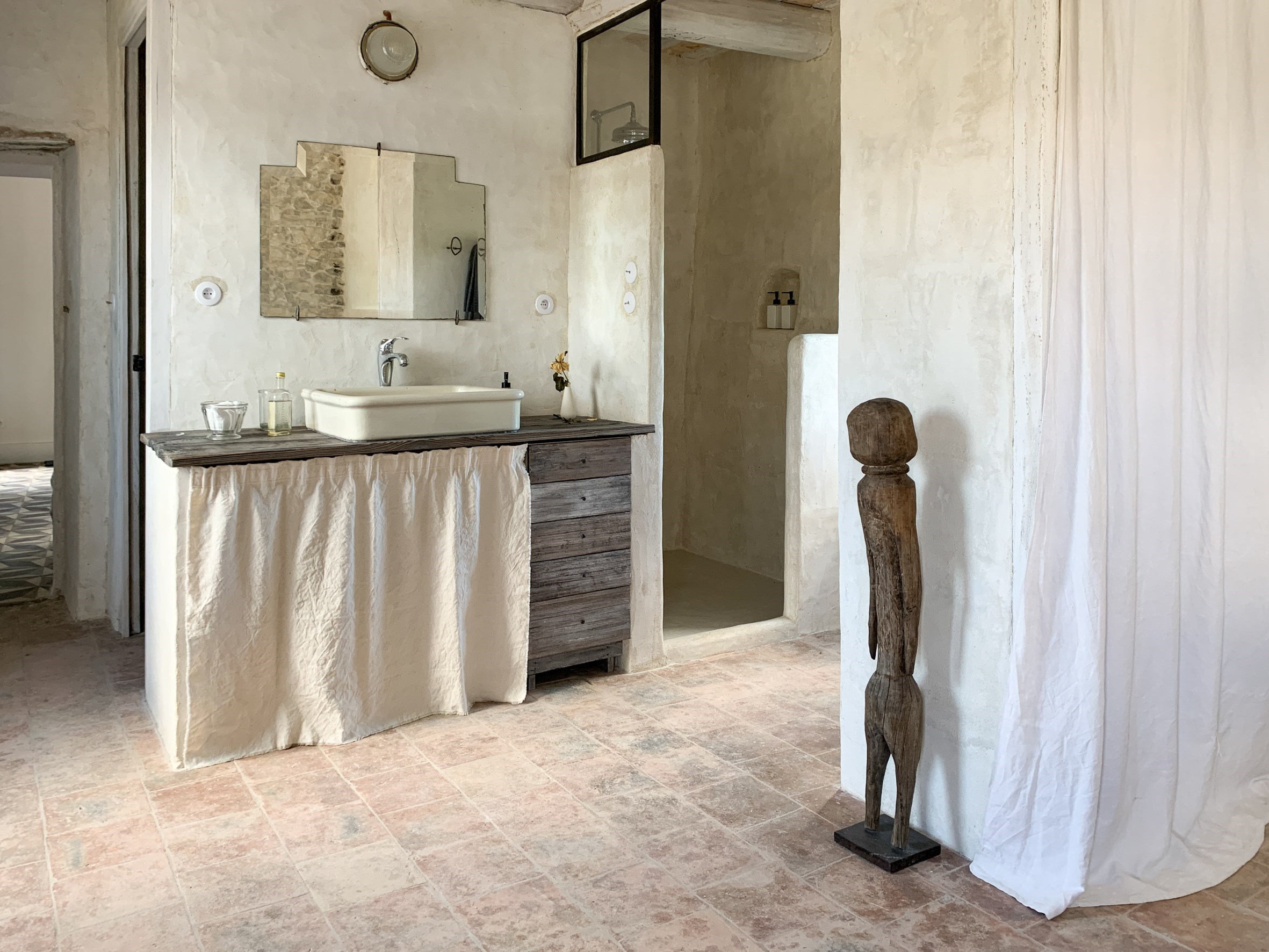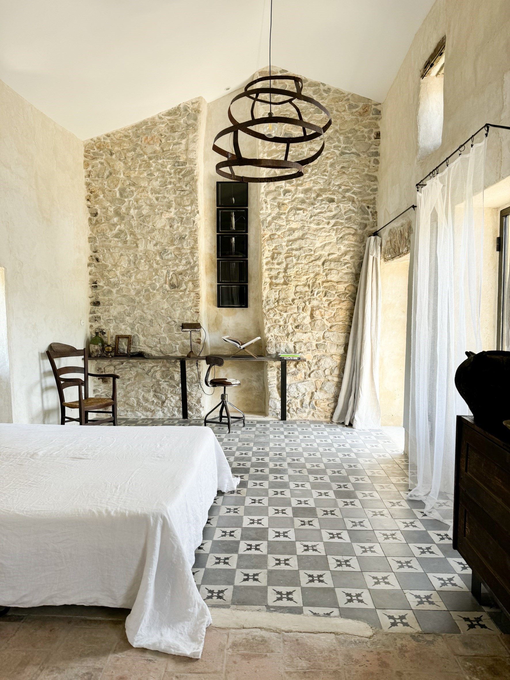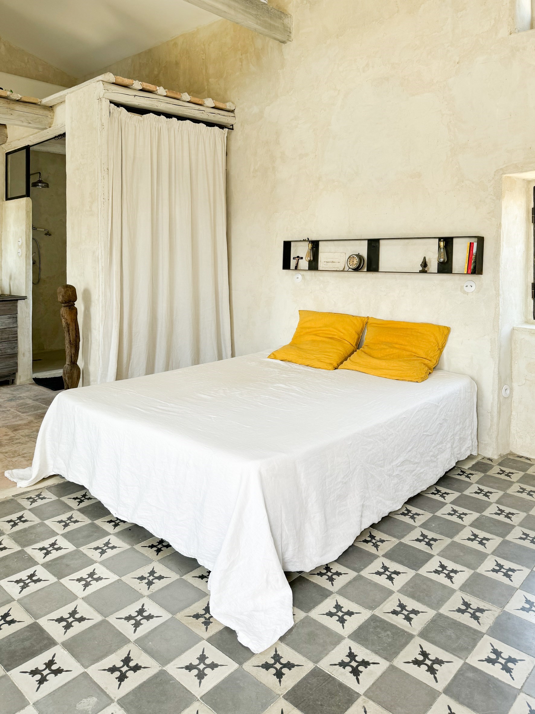 Situé au 1er étage du mas, cet appartement est composé d’une première pièce faisant office de salon et de cuisine. La seconde pièce, très spacieuse avec une hauteur sous plafond de plus de 4 mètres accueille la chambre ainsi que la salle de bain ouverte.