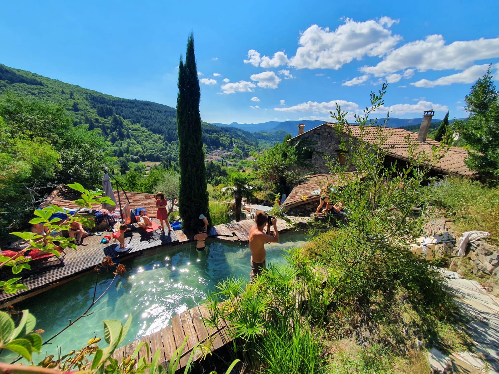 Maison de famille en pierres entourée de traversiers d’oliviers, un bassin naturel pour se baigner, de belles terrasses et une superbe vue sur les Cévennes