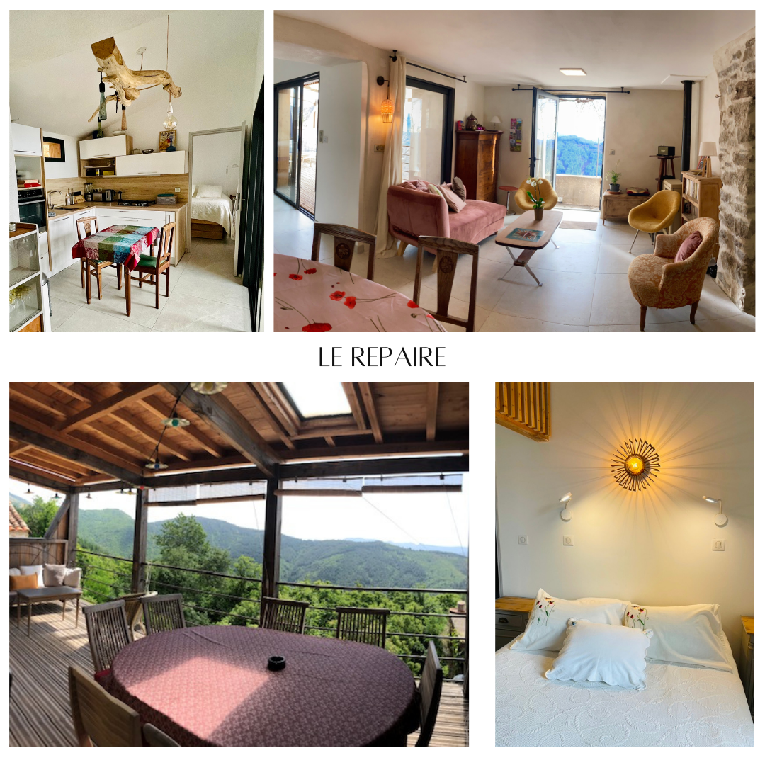 Le Repaire dispose de 3 chambres élégantes (dont une avec une mezzanine pour accueillir 2 personnes supplémentaires). Chacune dispose de sa propre salle d’eau. La pièce de vie, chaleureuse et lumineuse, comprend une cuisine toute équipée. Elle s’ouvre sur une belle terrasse couverte avec une vue exceptionnelle sur les Cévennes.