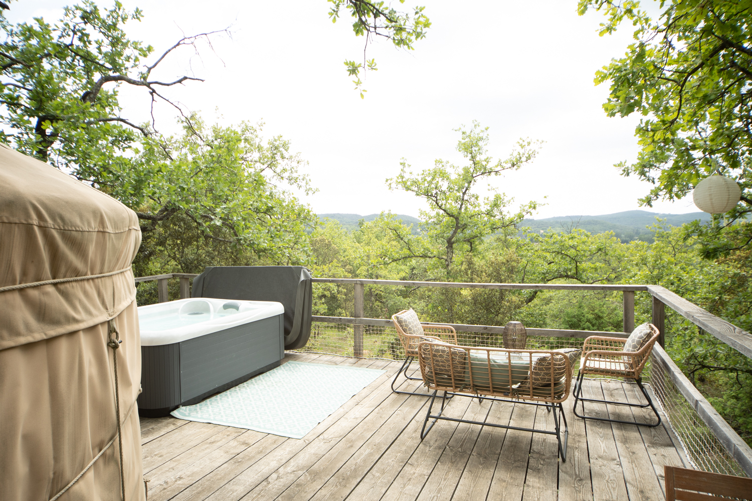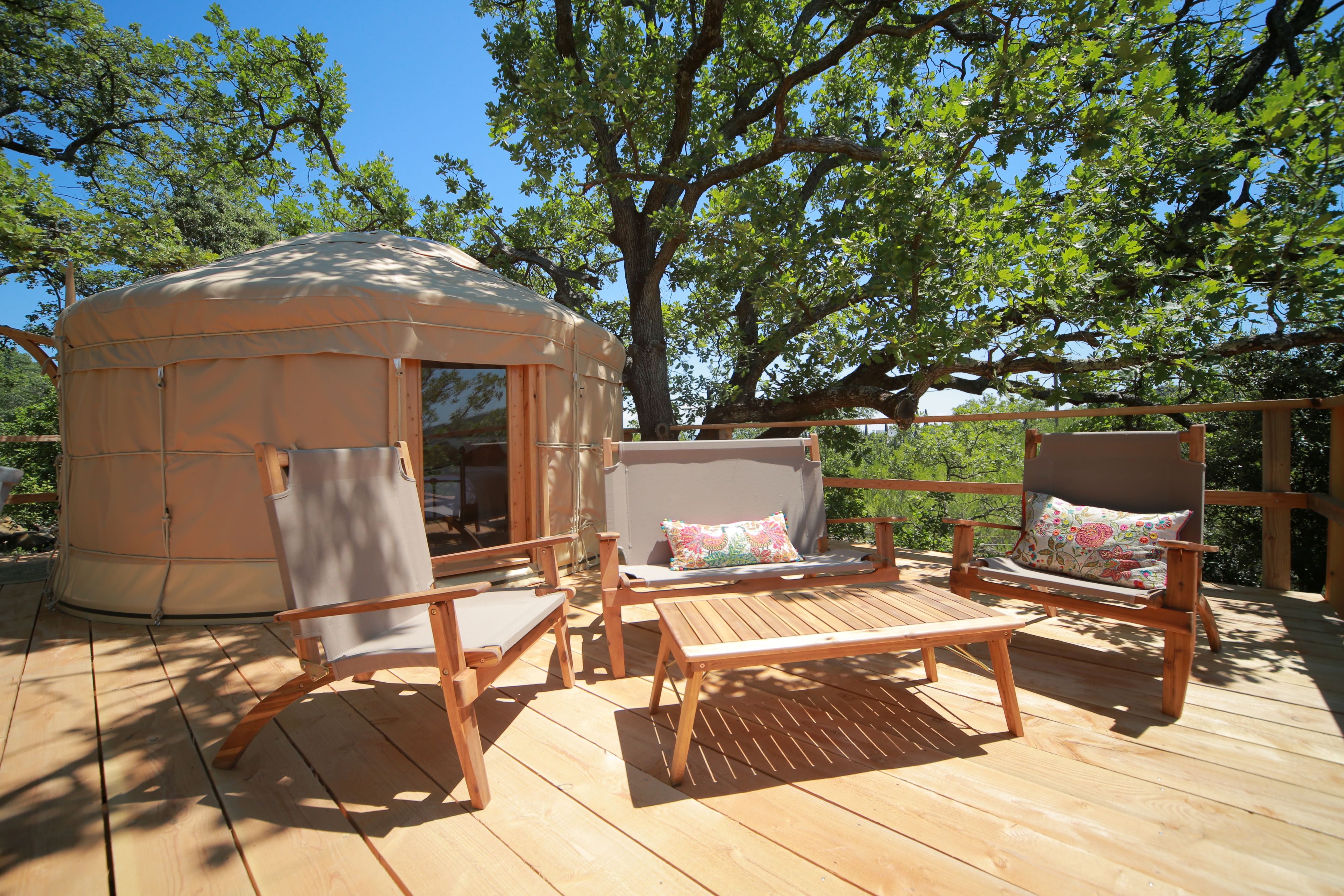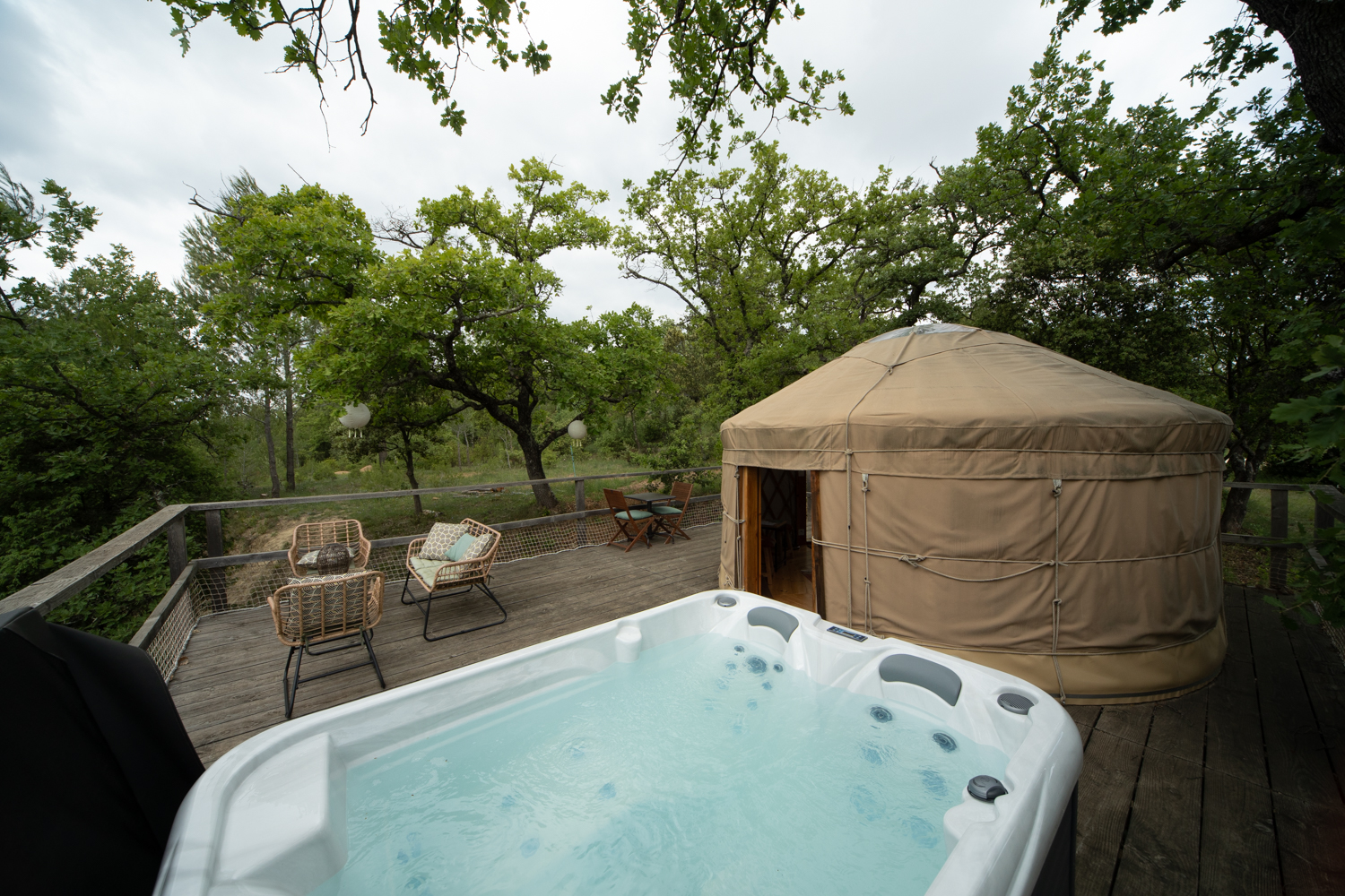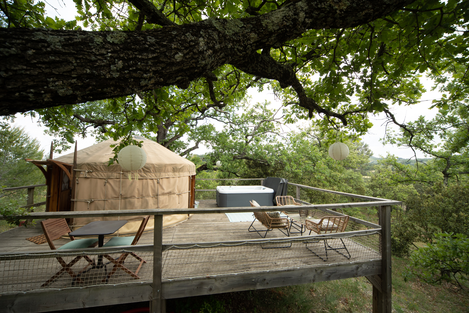 Nos yourtes sont nichées dans la nature au sein d’une propriété familiale, à l’ombre des chênes verts et sans vis-à-vis avec des vues imprenables sur les paysages forestiers et le Mont Ventoux. Chacune est soigneusement placée sur une grande plateforme en bois sur pilotis avec le jacuzzi privé et le coin salon extérieur, où l’on peut profiter d’un panier apéritif en toute tranquillité. Une toilette sèche privée est aussi disponible à chaque yourte pour plus de confort.