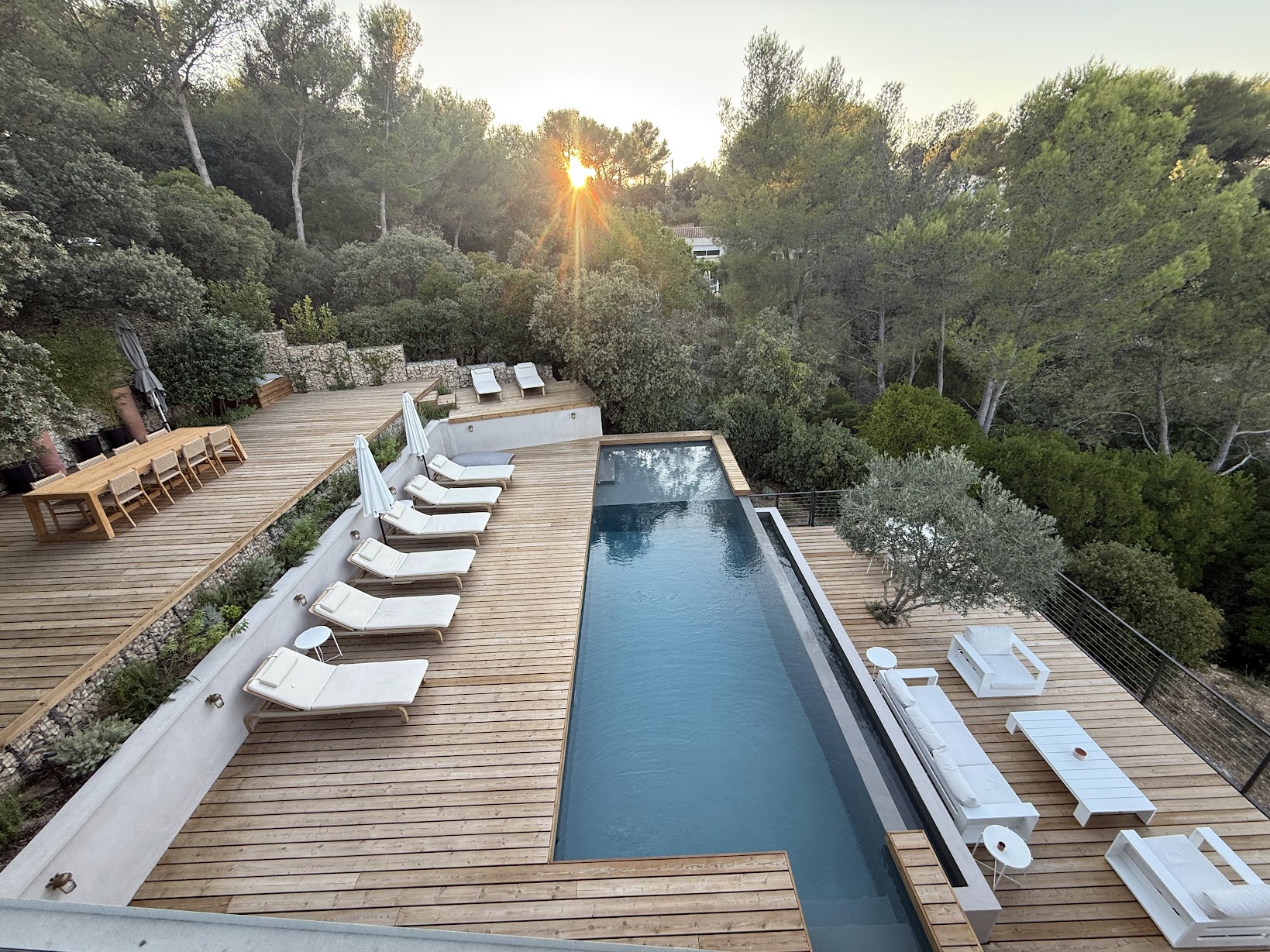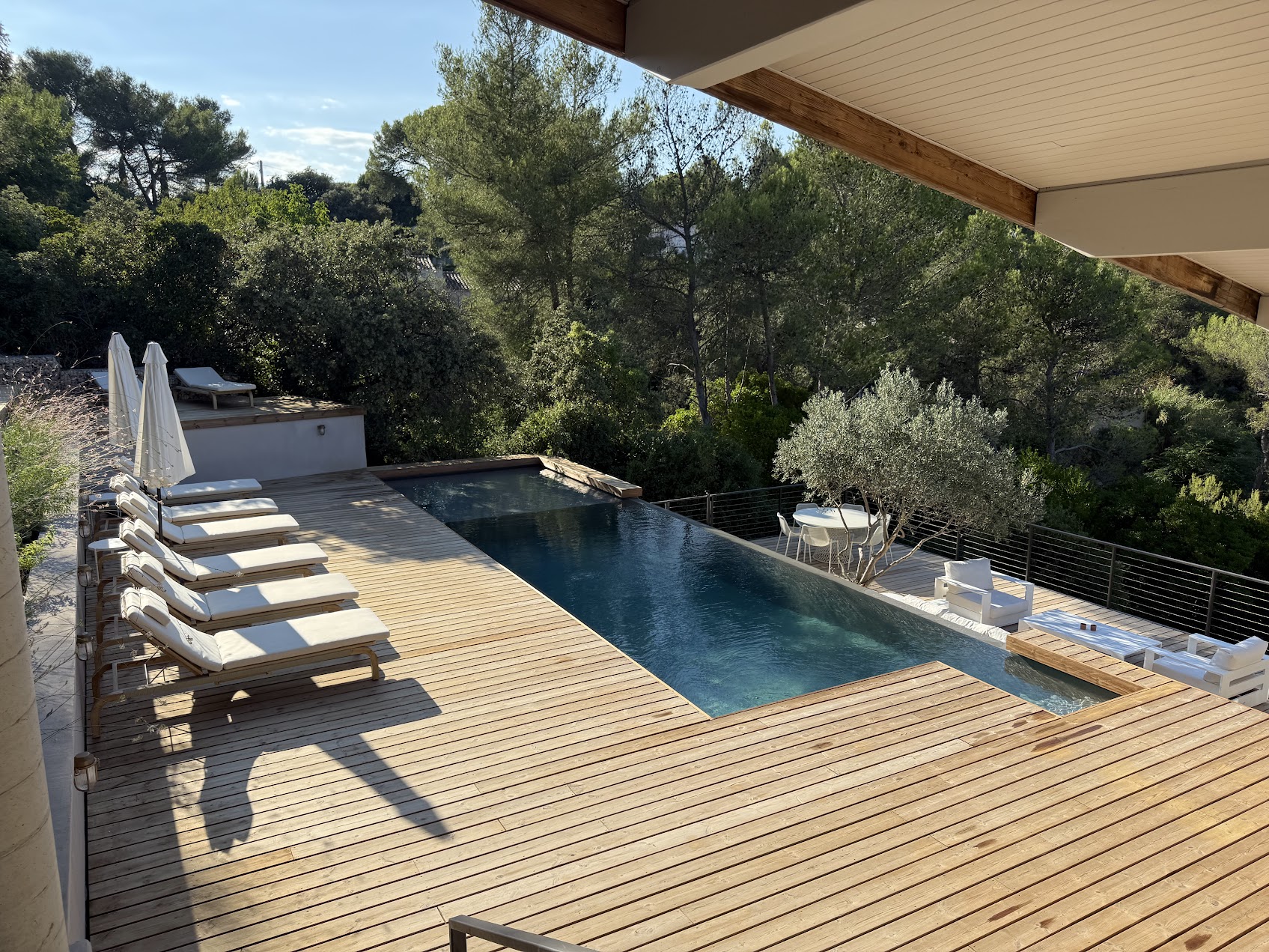 Superbe maison contemporaine nichée au cœur des bois, à quelques minutes du centre-ville, offrant terrasses en restanque, piscine privée et équipements haut de gamme pour un confort absolu.