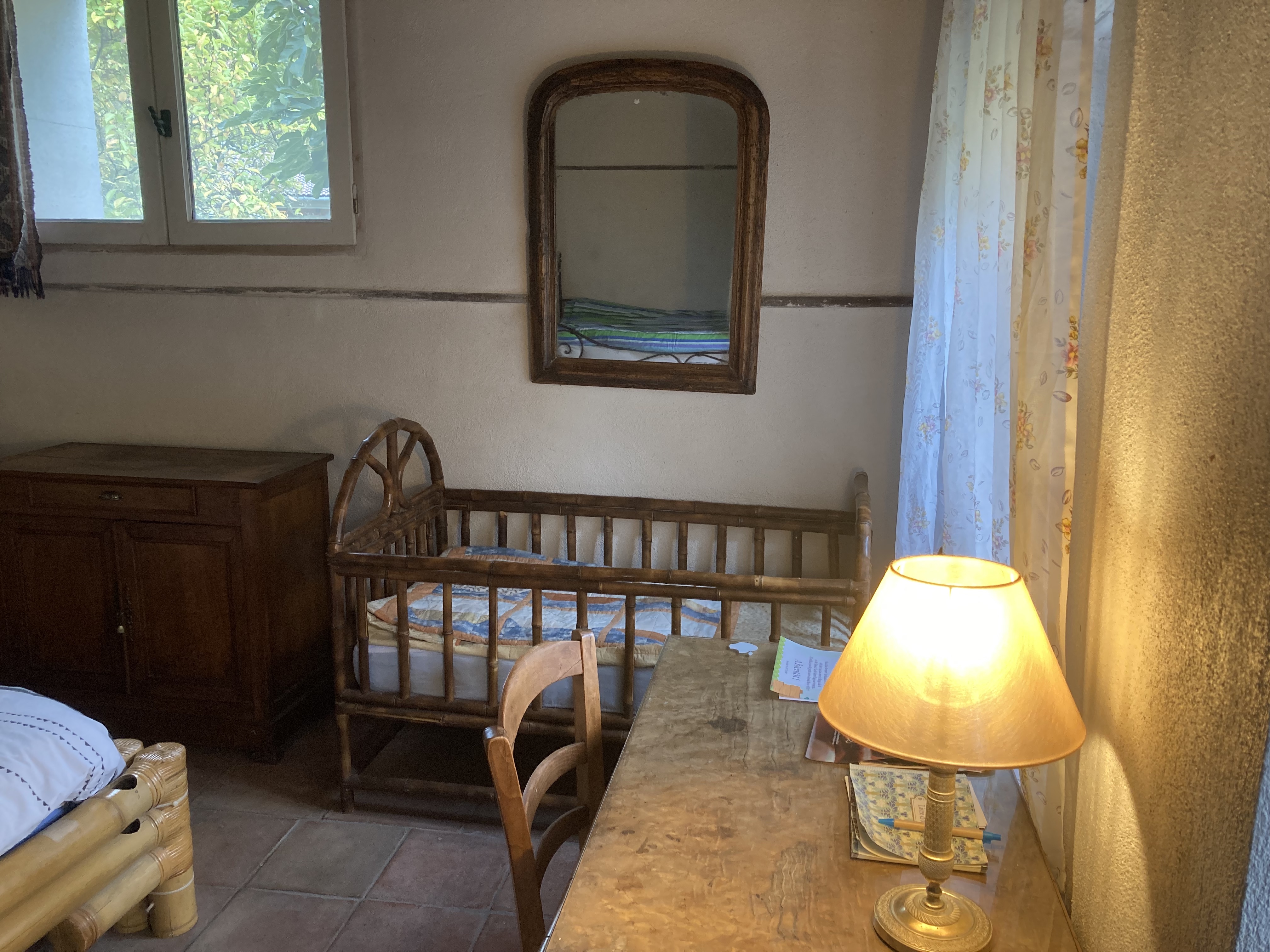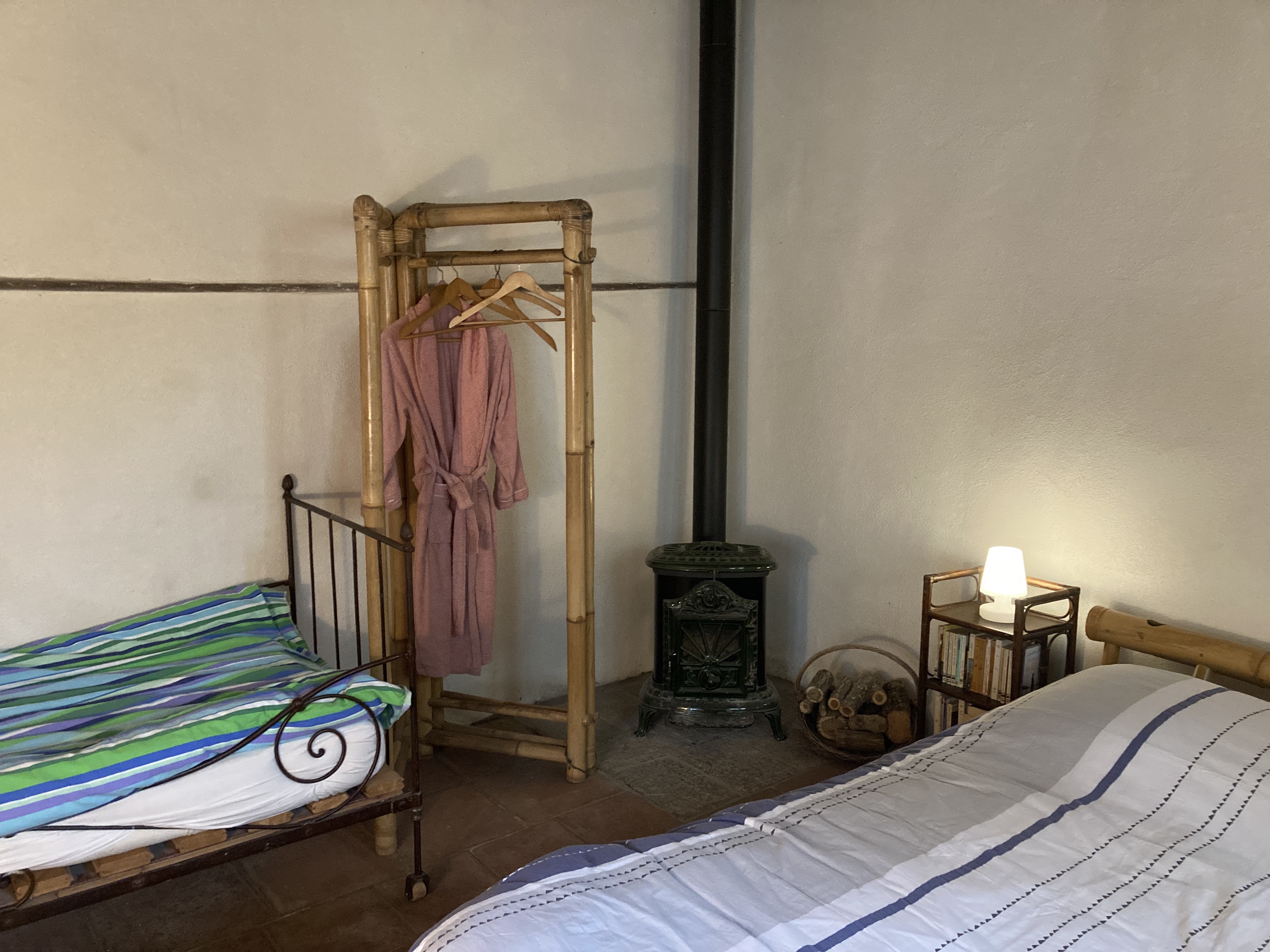 Trois mazets entourent le jardin. Pas d’électricité dans la chambre, chauffage au poële, lampes de chevet rechargeables… La cuisine donne sur une terrasse qui longe le jardin. La salle de bain se trouve dans un troisième mazet, avec chauffage électrique.
