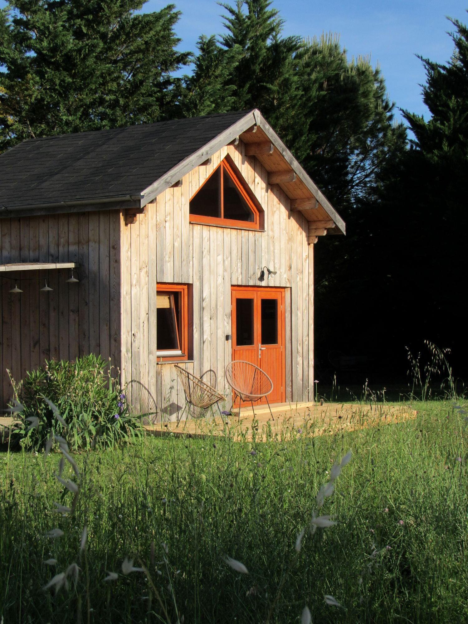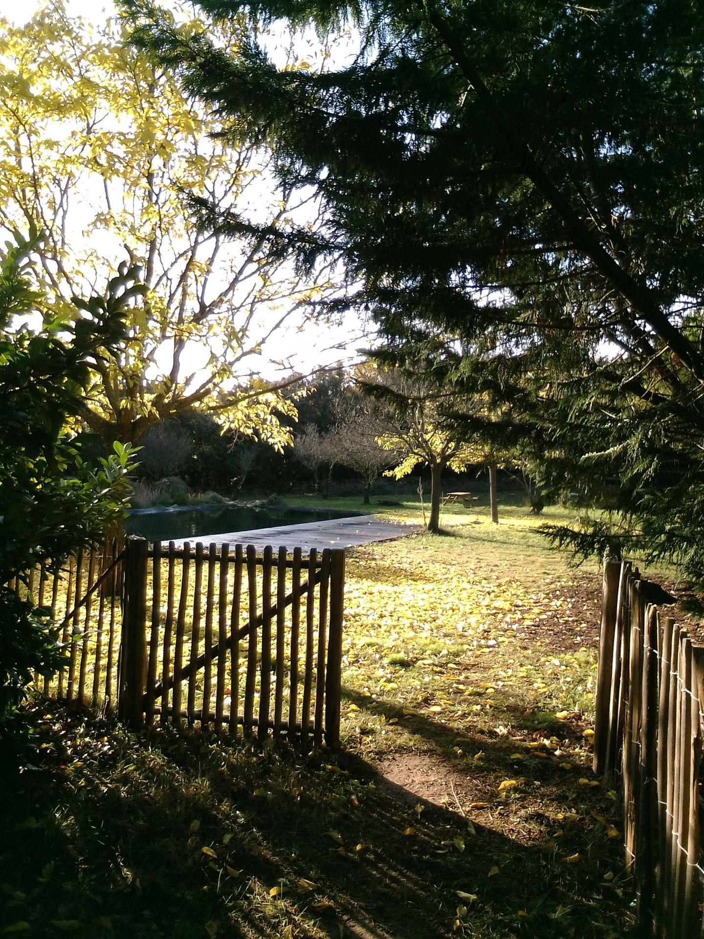 Petite maison insolite en bois massif sur le Domaine Pierres de Soleil, 2 ha de parc et prairie en bordure de forêt avec un étang de baignade naturelle.