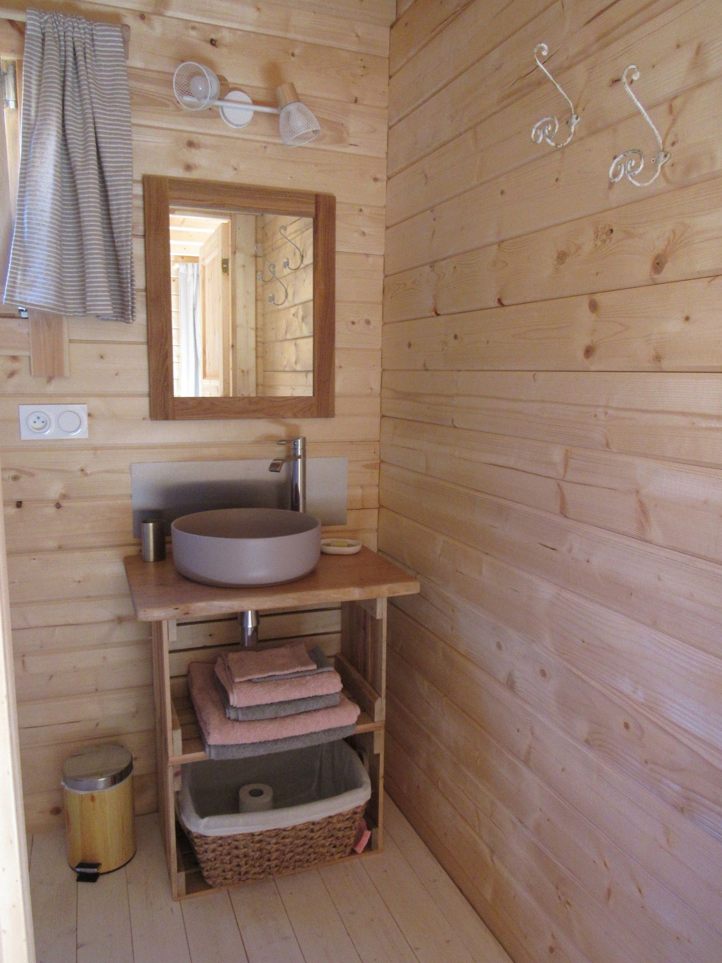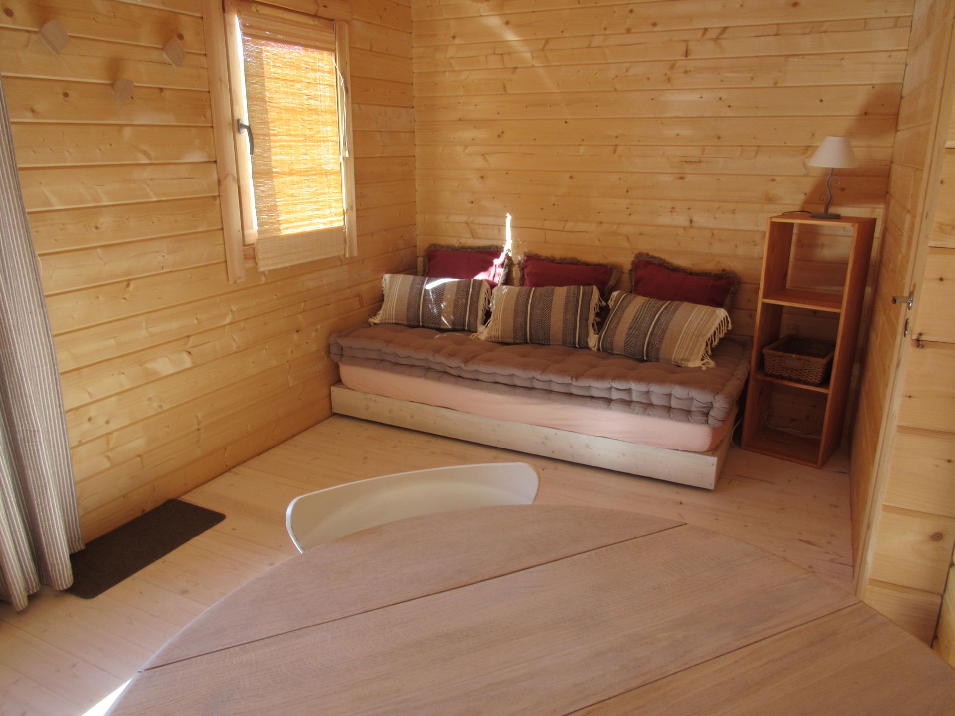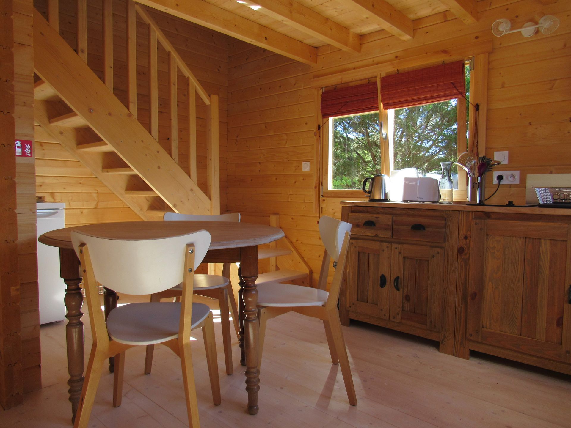 Au rez-de-chaussée il y a une pièce de vie qui comporte un coin salon (le canapé se transforme en lit d’une personne) et un coin cuisine ainsi qu’une salle d’eau.