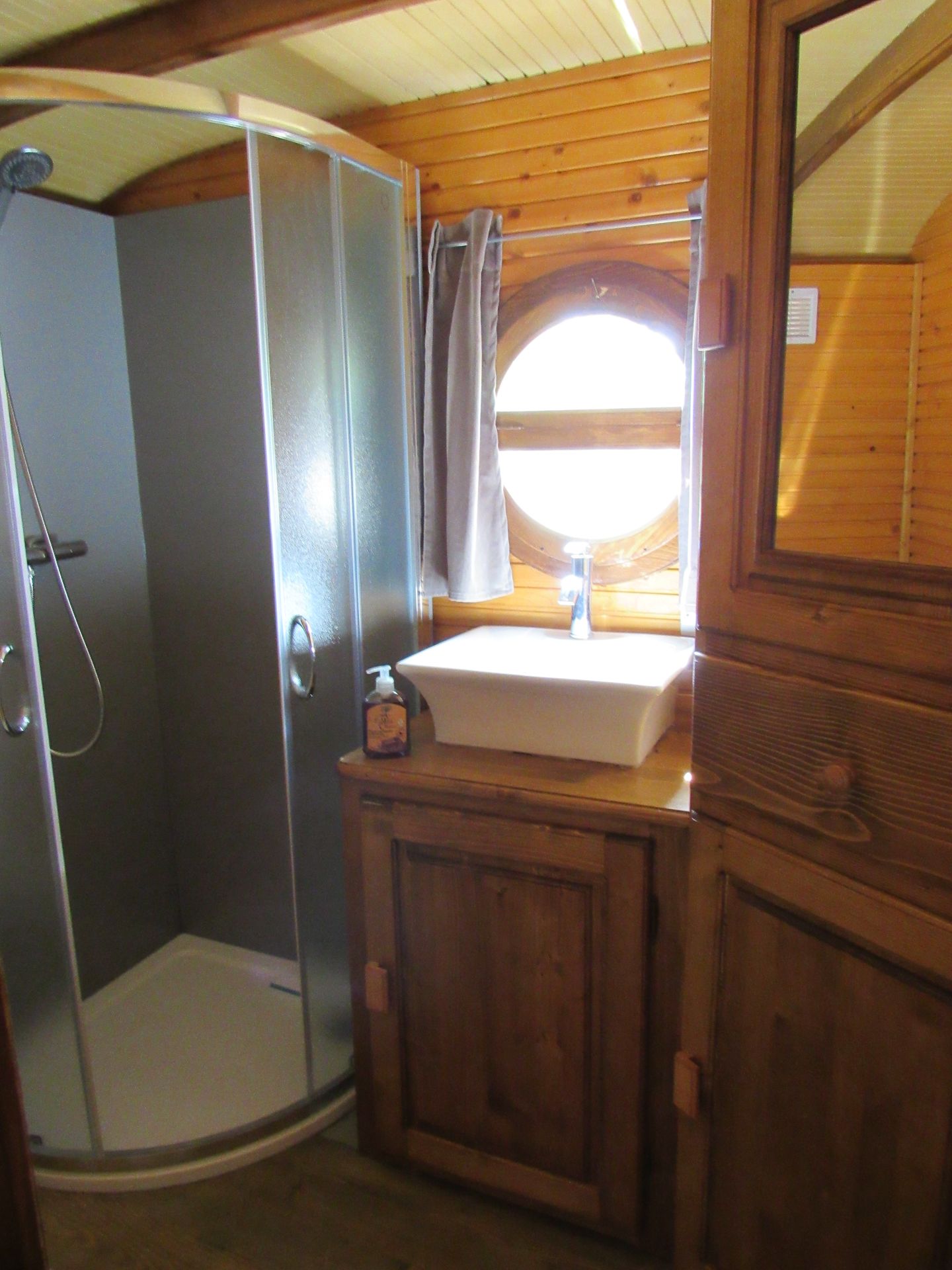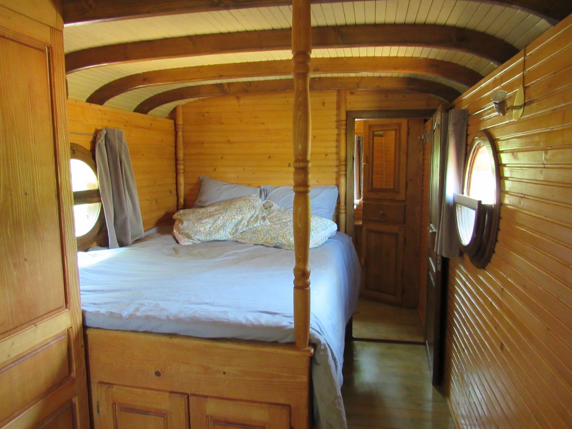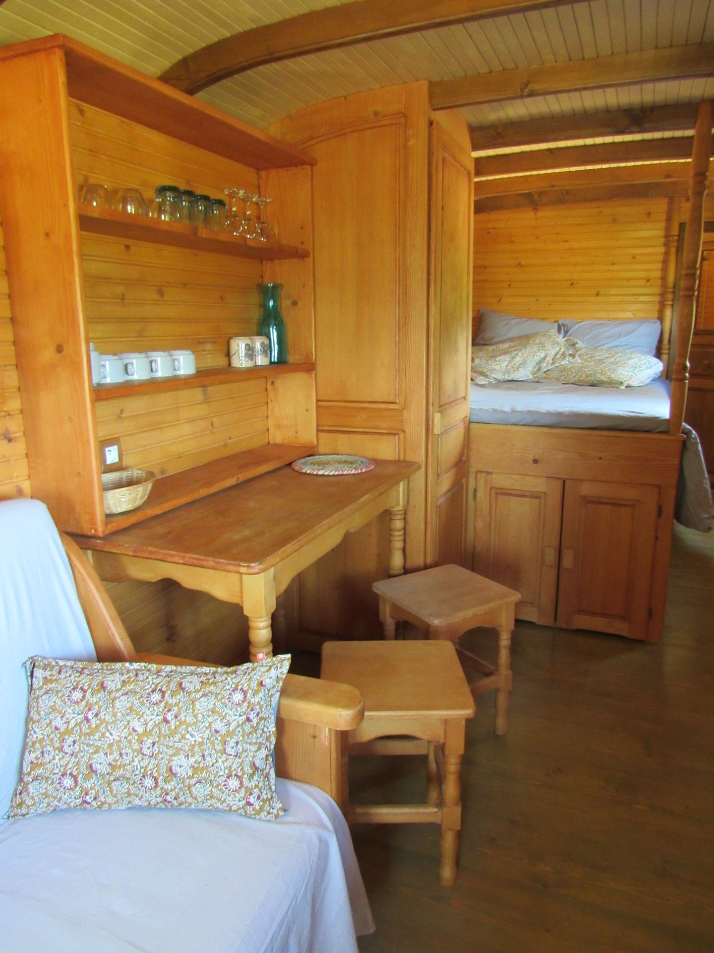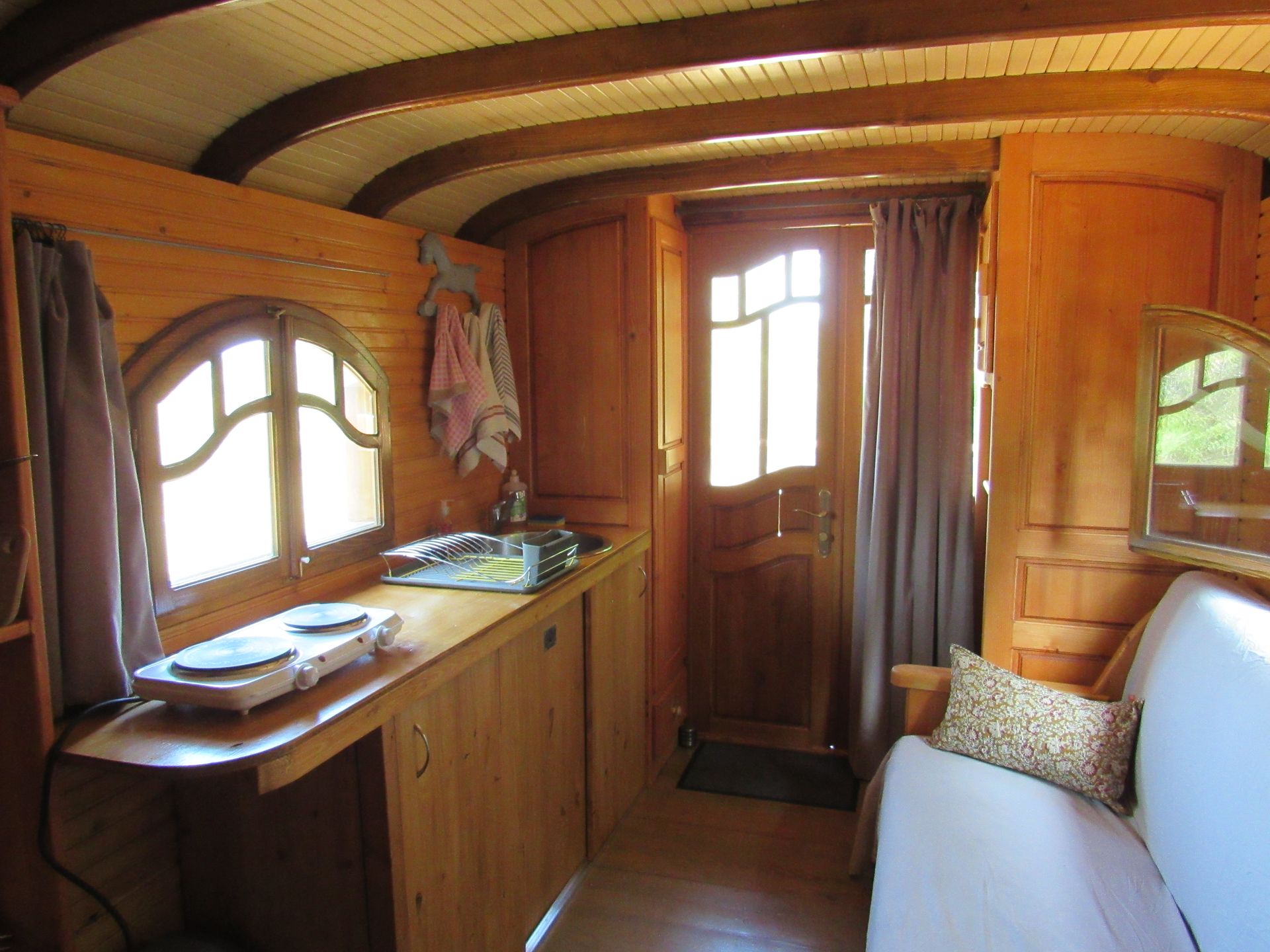 La Roulotte est aménagée avec un canapé, un coin cuisine, un lit surélevé, de très nombreux rangements et une salle d’eau.