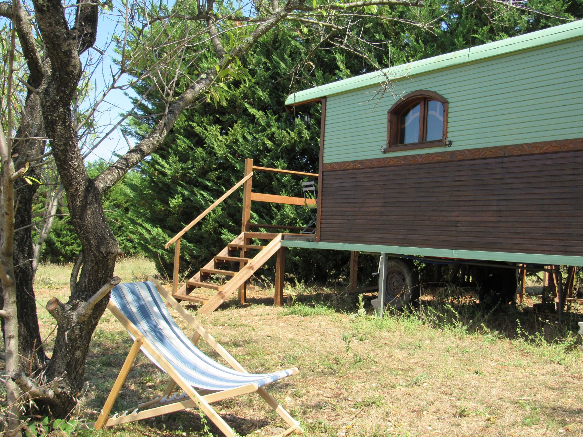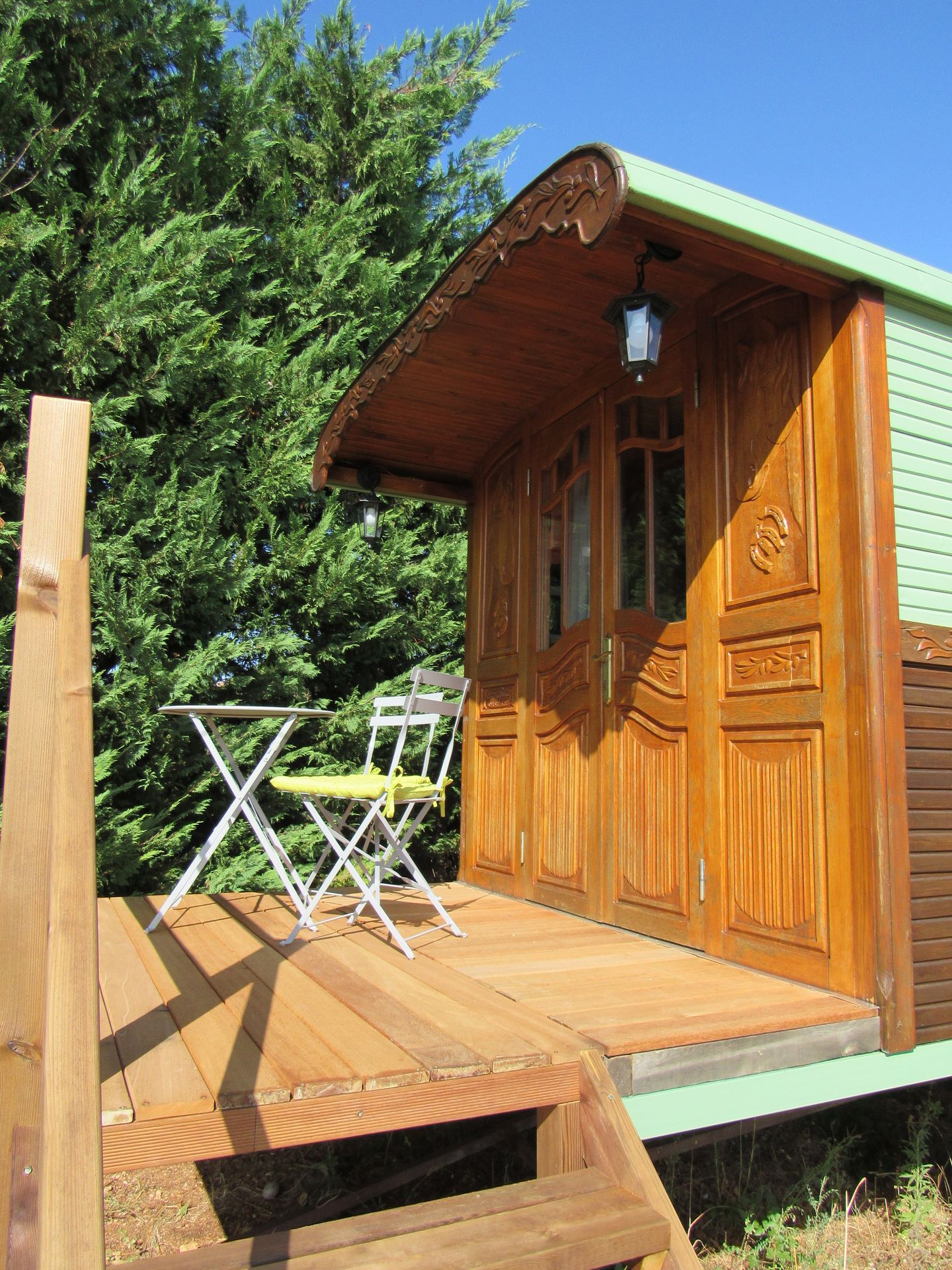 Roulotte en bois sur le domaine Pierres de Soleil, 2 ha de parc et prairie en bordure de forêt avec un étang de baignade naturelle.