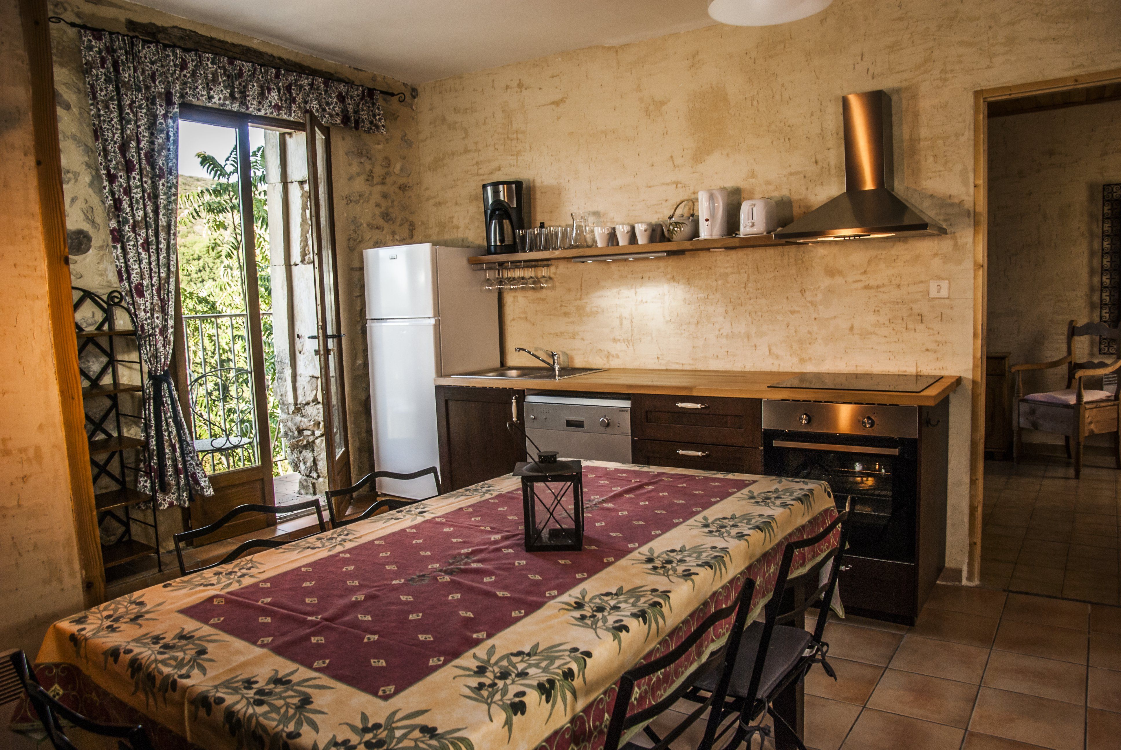 – Au rez-de-chaussée : une grande cuisine équipée (plaque vitrocéramique, évier, lave-vaisselle, bouilloire, grille‑pain) ; un salon avec un canapé clic-clac ; une salle d’eau avec douche et WC.
